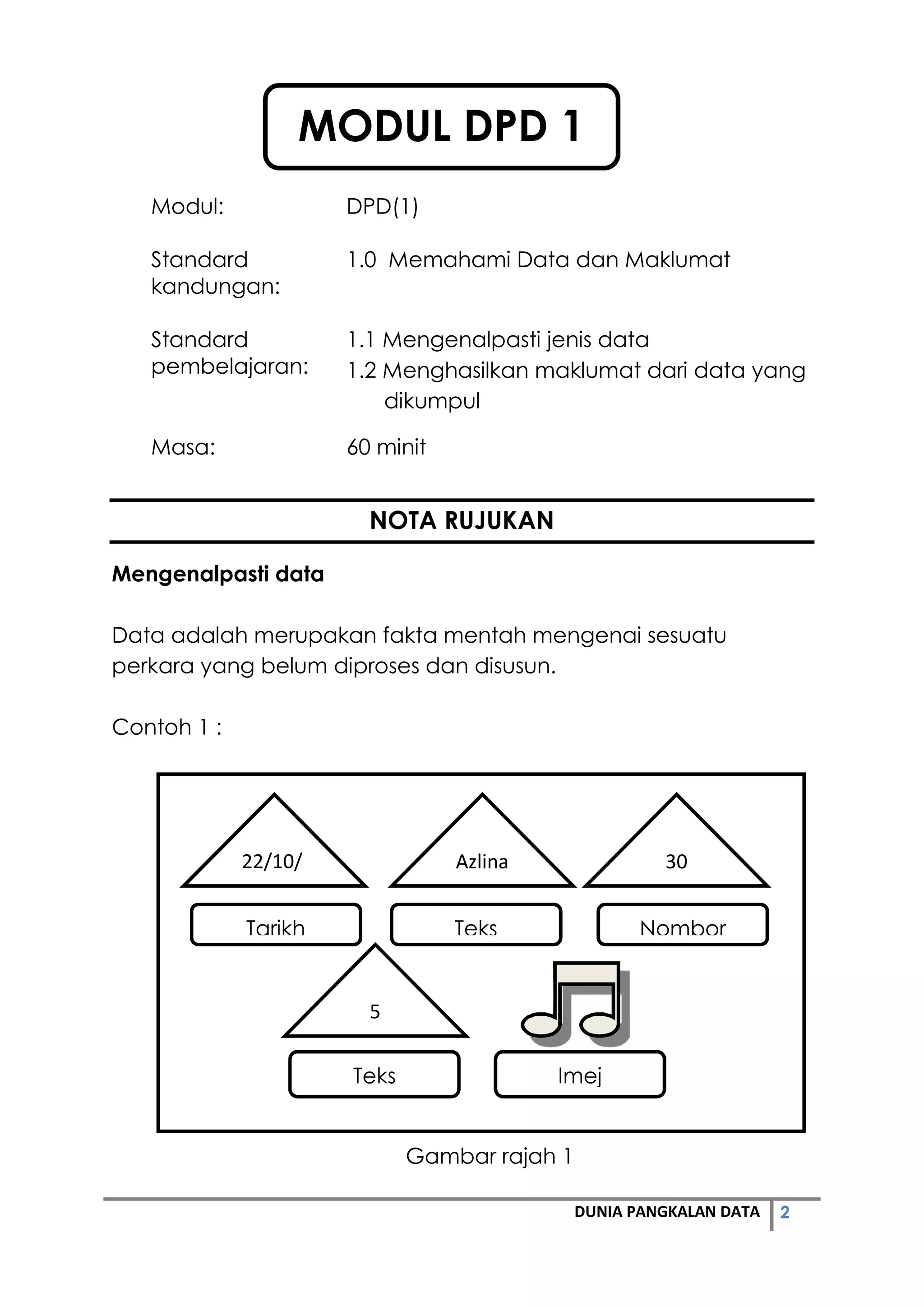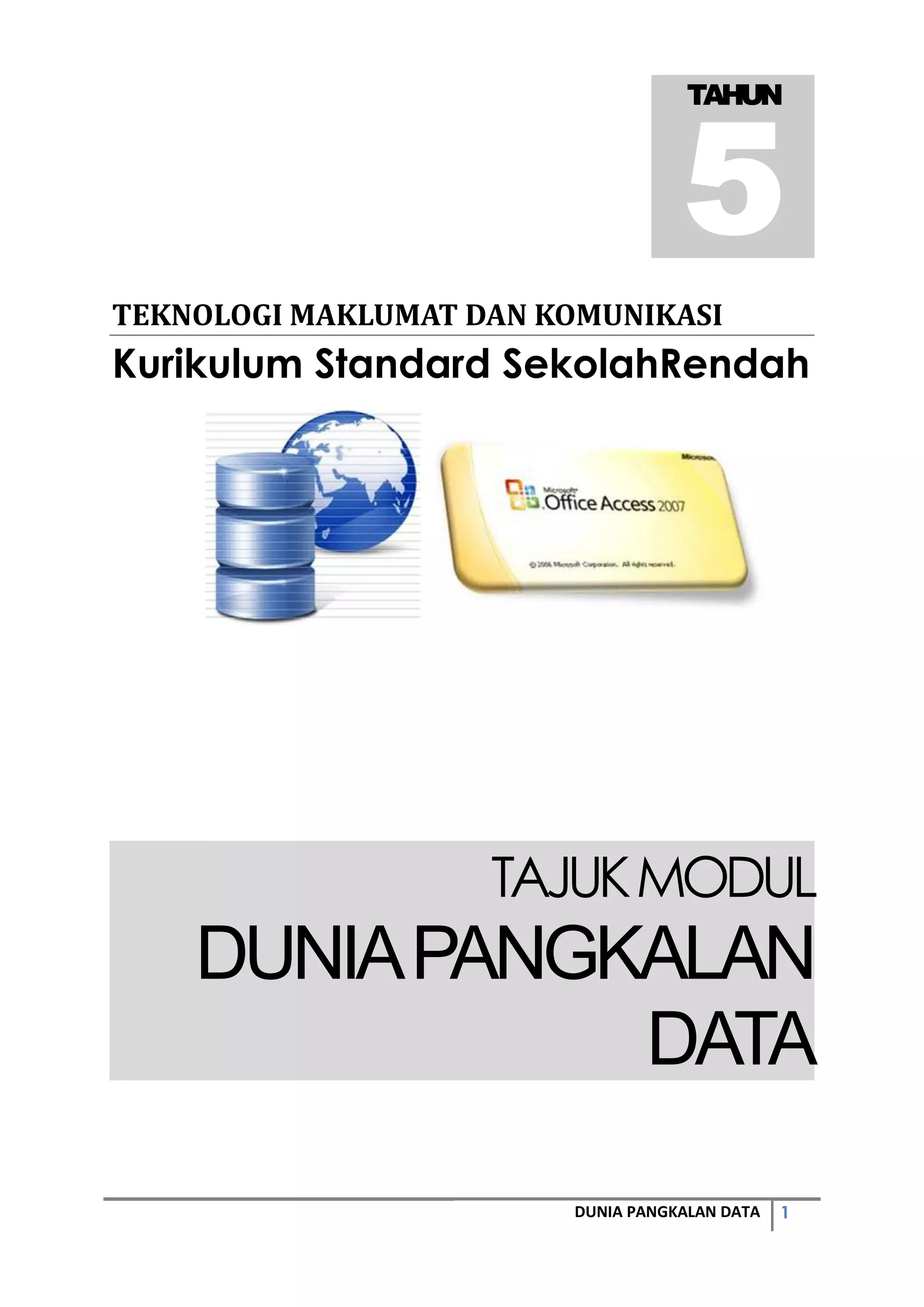 Dokumen ini adalah modul pengajaran mengenai dunia pangkalan data untuk tahun 5 yang merangkumi pemahaman tentang data dan maklumat. Ia termasuk aktiviti berkumpulan dan individu yang membolehkan murid mengenal pasti dan mengumpul data untuk menghasilkan maklumat, serta penerangan tentang sistem pangkalan data dan contohnya. Penilaian juga disediakan untuk mengukur pencapaian murid dalam memahami konsep-konsep ini.