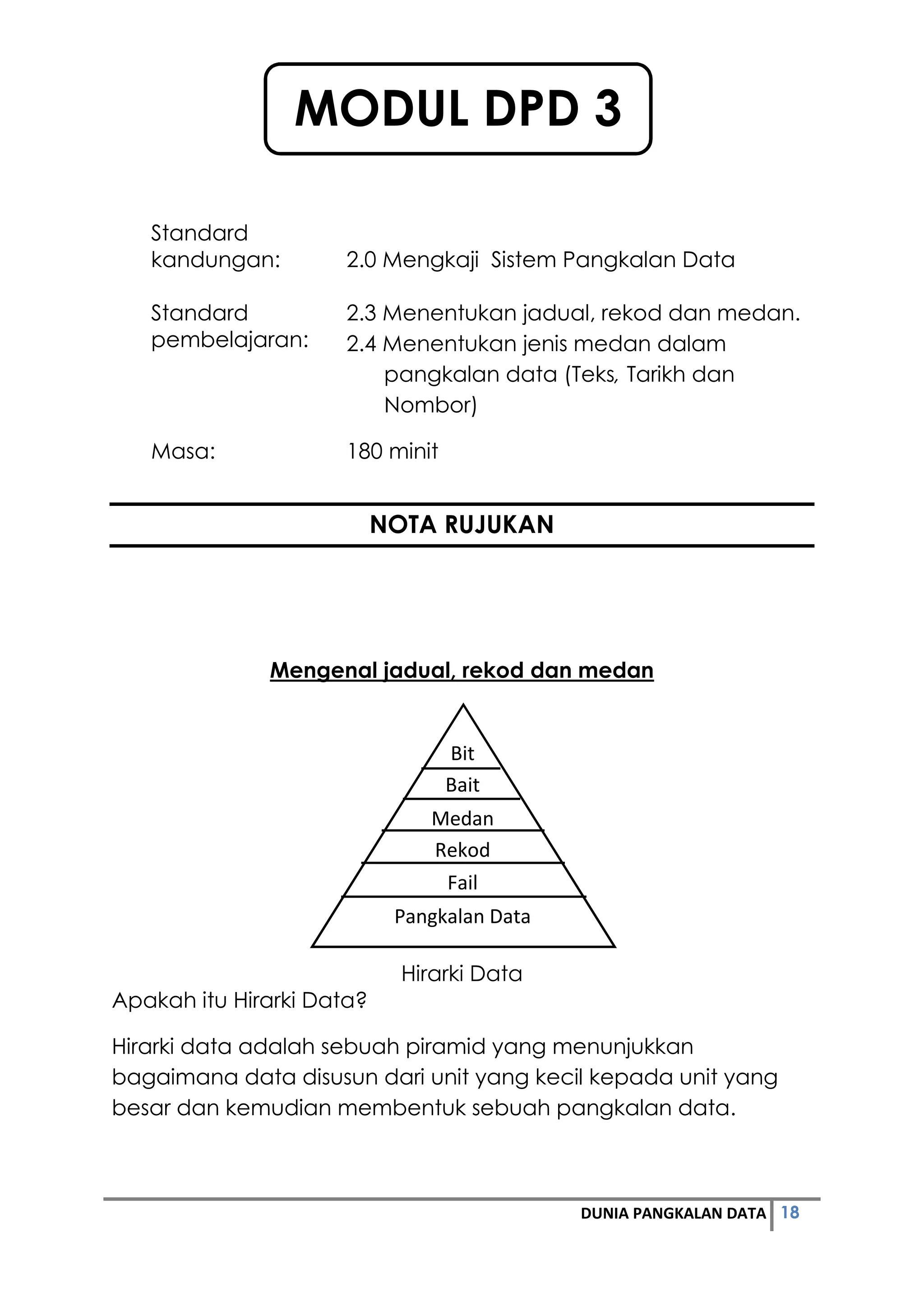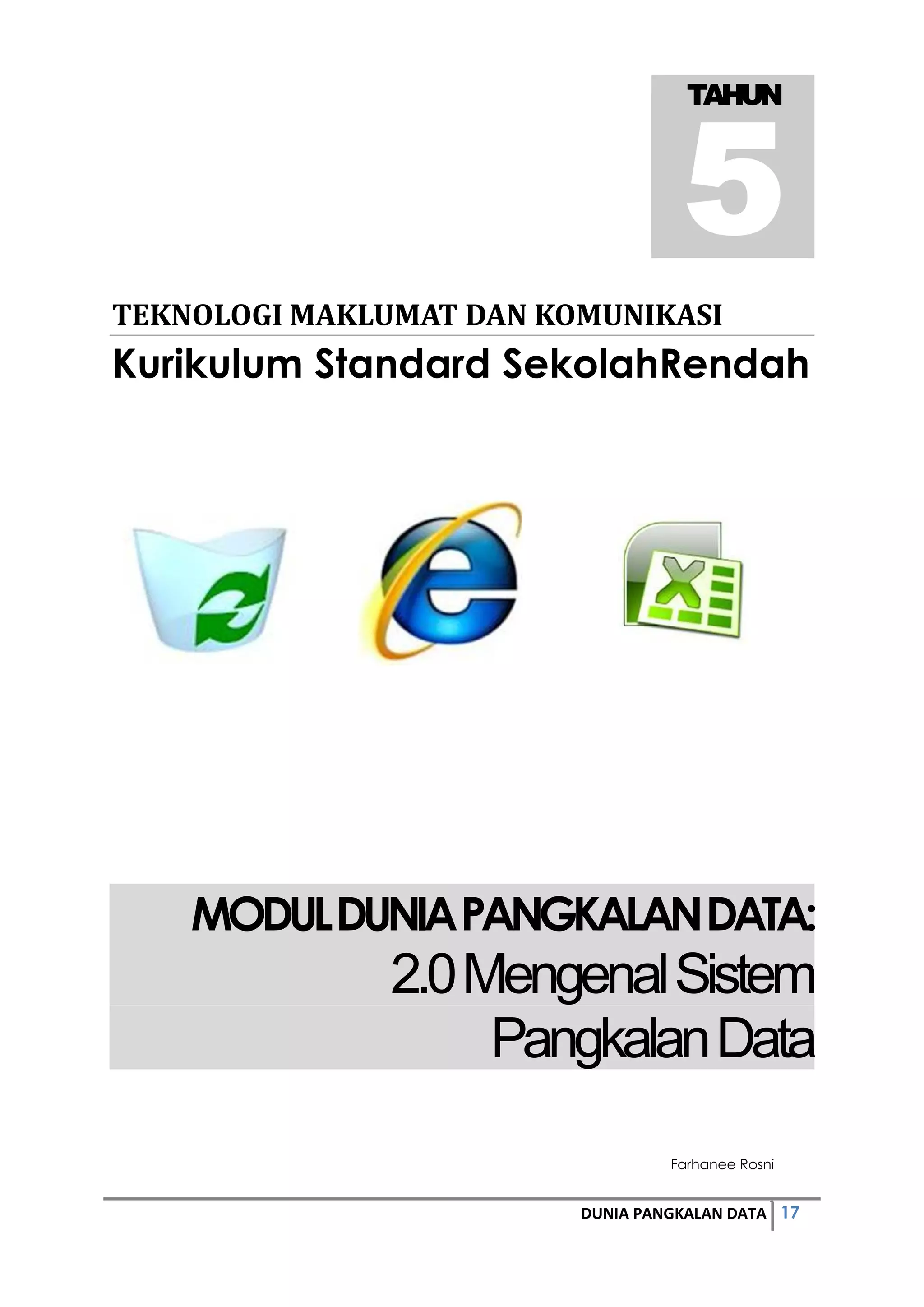 Dokumen ini membincangkan kurikulum mengenai sistem pangkalan data untuk pelajar tahun 5, termasuk pengenalan kepada jadual, rekod, dan medan dengan masa pembelajaran 180 minit. Ia menerangkan jenis data dalam pangkalan data, contohnya teks, tarikh, dan nombor, serta aktiviti yang melibatkan pembinaan jadual menggunakan Microsoft Word. Penilaian juga dilakukan untuk menilai pemahaman pelajar mengenai konsep-konsep tersebut.