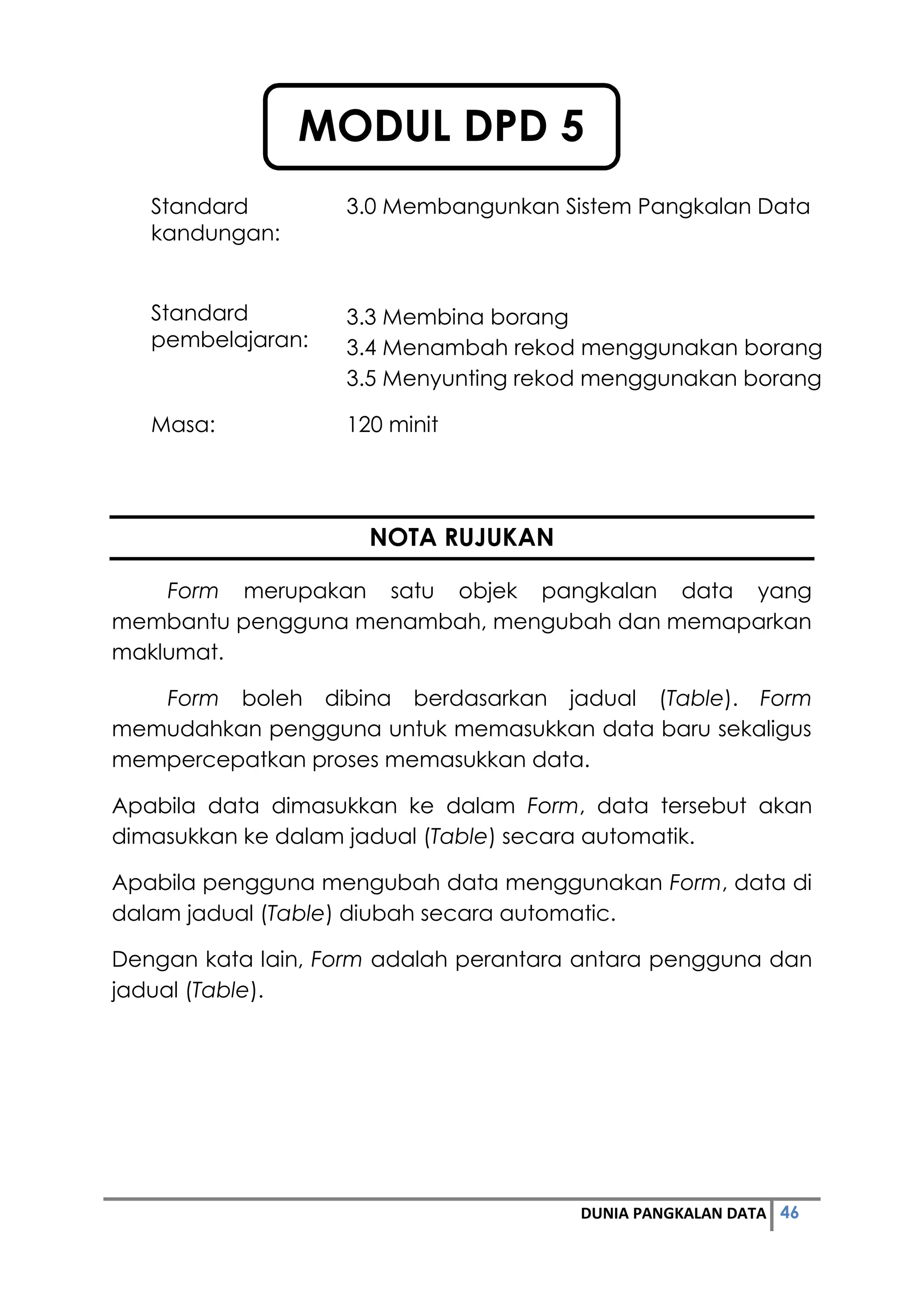 Dokumen ini adalah modul pembelajaran mengenai pengembangan sistem pangkalan data untuk siswa tahun 5, dengan fokus pada penggunaan borang dalam Microsoft Access. Ia merinci langkah-langkah untuk membina, menyunting, dan menambah rekod menggunakan borang, yang berfungsi sebagai pengantara antara pengguna dan tabel. Terdapat juga penilaian pencapaian murid setelah menyelesaikan aktiviti yang dijelaskan.