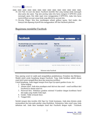 Dokumen ini menjelaskan tentang Facebook sebagai jejaring sosial yang didirikan oleh Mark Zuckerberg pada 4 Februari 2004, yang kini memiliki lebih dari 100 juta pengguna aktif. Keunggulan Facebook termasuk jaringan, tata letak yang bersih, dan fitur grup atau album foto yang memudahkan interaksi antar pengguna. Proses pendaftaran dan fitur-fitur utama platform juga dijelaskan secara rinci, termasuk cara menonaktifkan akun.