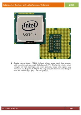 Dokumen ini menjelaskan berbagai komponen perangkat keras komputer, termasuk papan utama, CPU, RAM, dan penyimpanan, serta cara merakit komputer dan memasang sistem operasi. Selain itu, dokumen tersebut juga membahas pentingnya server jaringan dalam pengelolaan layanan bagi institusi dengan banyak pengguna. Langkah-langkah praktis dalam penginstalan komponen dan sistem operasi Windows 8 dijelaskan untuk memfasilitasi pemahaman dan penerapan.