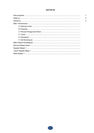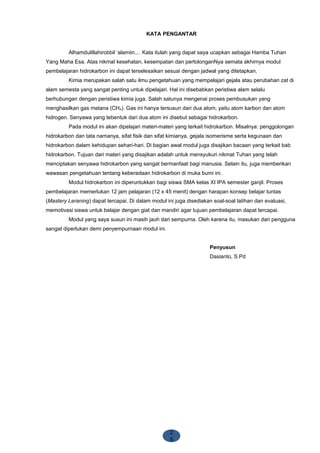 Modul ini membahas tentang hidrokarbon dan sumbernya di alam. Hidrokarbon merupakan senyawa organik yang hanya terdiri dari karbon dan hidrogen. Metana merupakan hidrokarbon paling sederhana yang ditemukan dalam biogas yang dihasilkan dari proses fermentasi anaerobik limbah hewan ternak. Atom karbon memiliki sifat yang memungkinkannya membentuk rantai karbon dalam senyawa organik seperti hidrokarbon.