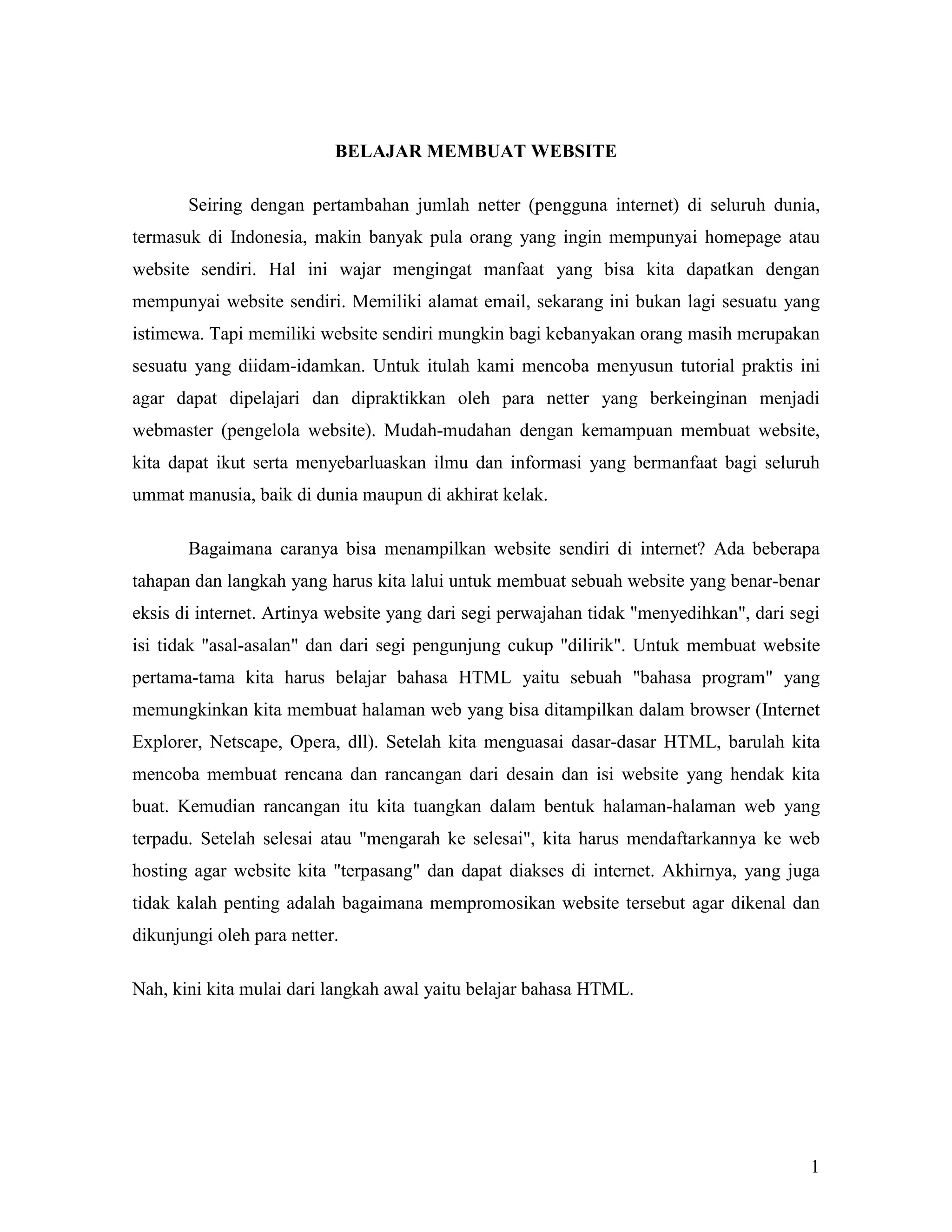 Dokumen ini adalah tutorial mengenai cara membuat website dengan menggunakan bahasa HTML. Tutorial ini menjelaskan berbagai langkah mulai dari dasar hingga teknik pemformatan, termasuk penggunaan tag HTML untuk membuat struktur halaman web. Dengan mengikuti petunjuk ini, pembaca diharapkan dapat membuat dan mempromosikan website mereka sendiri.