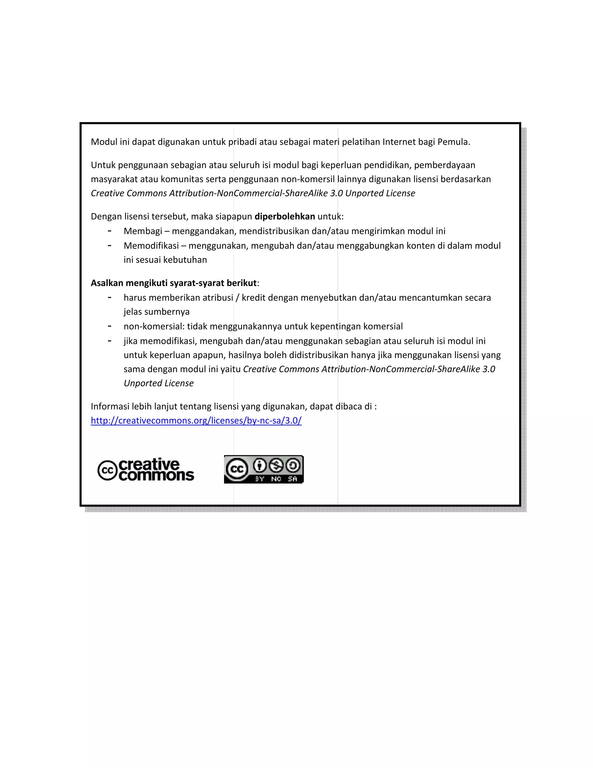 Modul ini memberikan panduan singkat tentang berbagai aktivitas dasar di internet seperti menggunakan browser web, mencari informasi melalui mesin pencari, dan menggunakan layanan email, pesan singkat, serta blog."