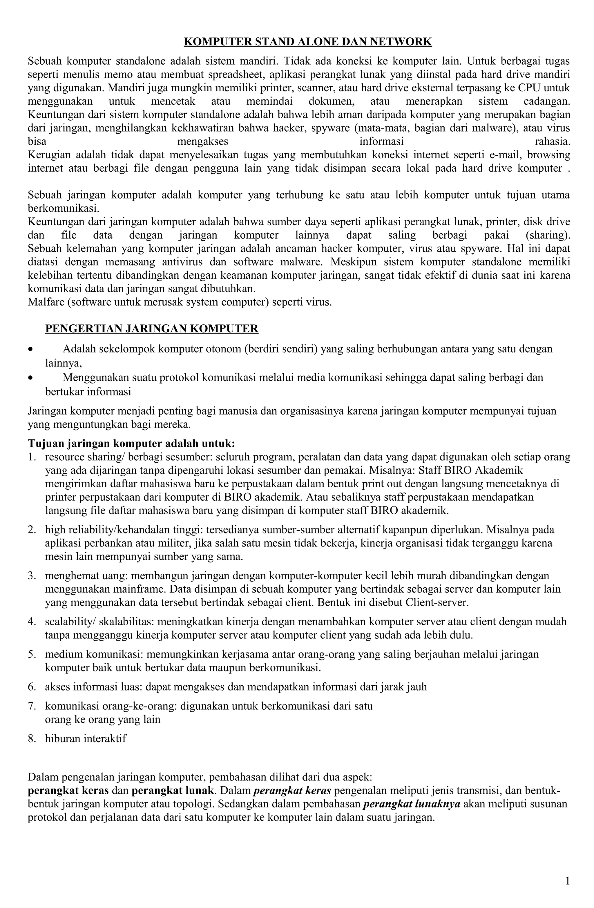 Ada dua jenis komputer utama, yaitu komputer standalone dan komputer jaringan. Komputer standalone bekerja secara mandiri tanpa terhubung ke komputer lain, sementara komputer jaringan terhubung satu sama lain untuk berkomunikasi dan berbagi sumber daya. Terdapat berbagai topologi jaringan seperti bus, star, ring, dan tree, serta dua model utama yaitu client-server dan peer-to-peer.