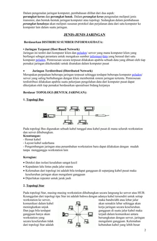 Ada dua jenis komputer utama, yaitu komputer standalone dan komputer jaringan. Komputer standalone bekerja secara mandiri tanpa terhubung ke komputer lain, sementara komputer jaringan terhubung satu sama lain untuk berbagi sumber daya seperti file dan printer. Komputer jaringan lebih efektif meskipun kurang aman dibanding komputer standalone.