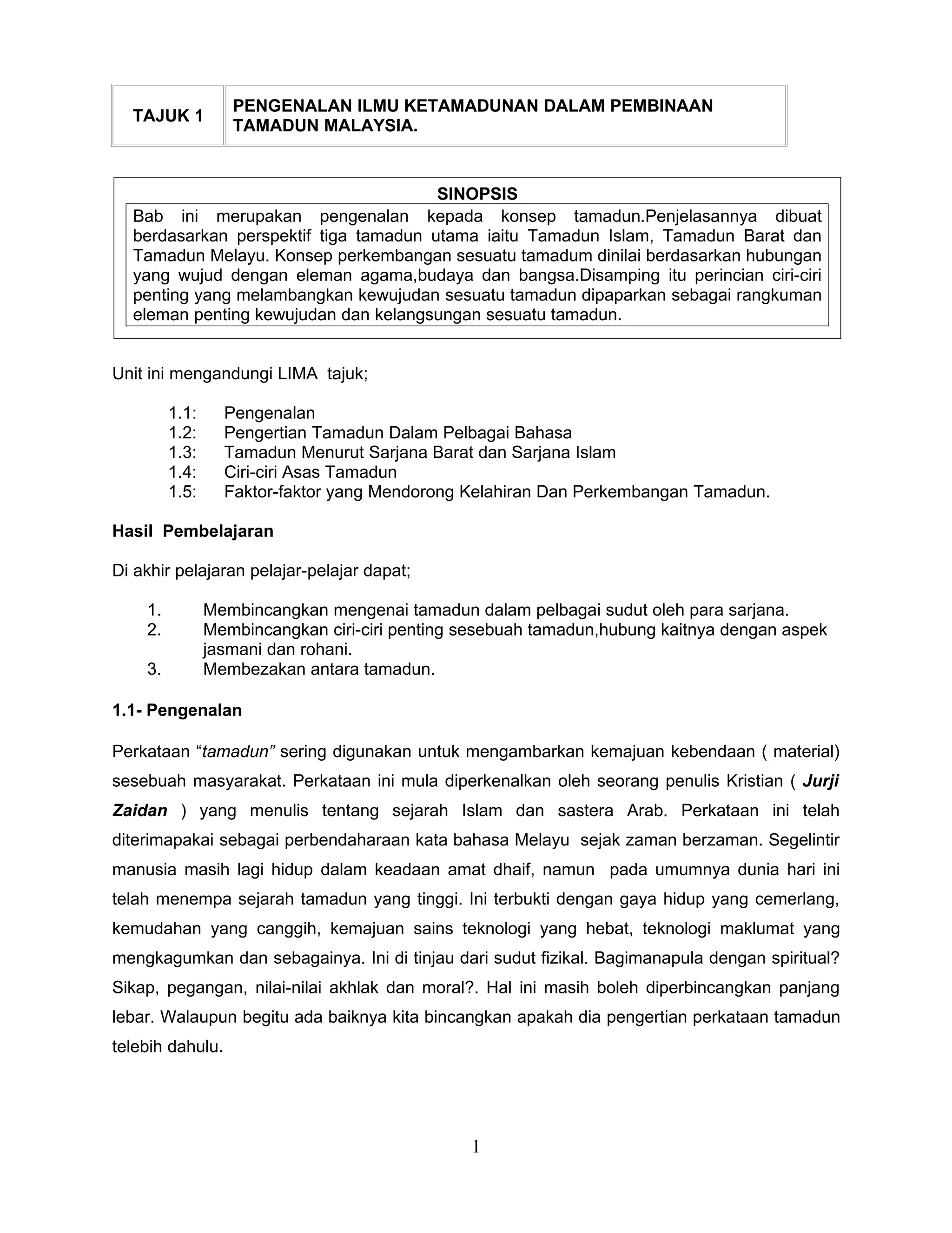 Bab ini memperkenalkan konsep tamadun dari perspektif tiga tamadun utama yaitu Islam, Barat dan Melayu. Ia juga menjelaskan ciri-ciri penting sesuatu tamadun seperti penempatan manusia, sistem sosial, bahasa dan teknologi. Faktor seperti sumber daya alam dan agama dipaparkan sebagai pendorong kelahiran dan perkembangan tamadun."
