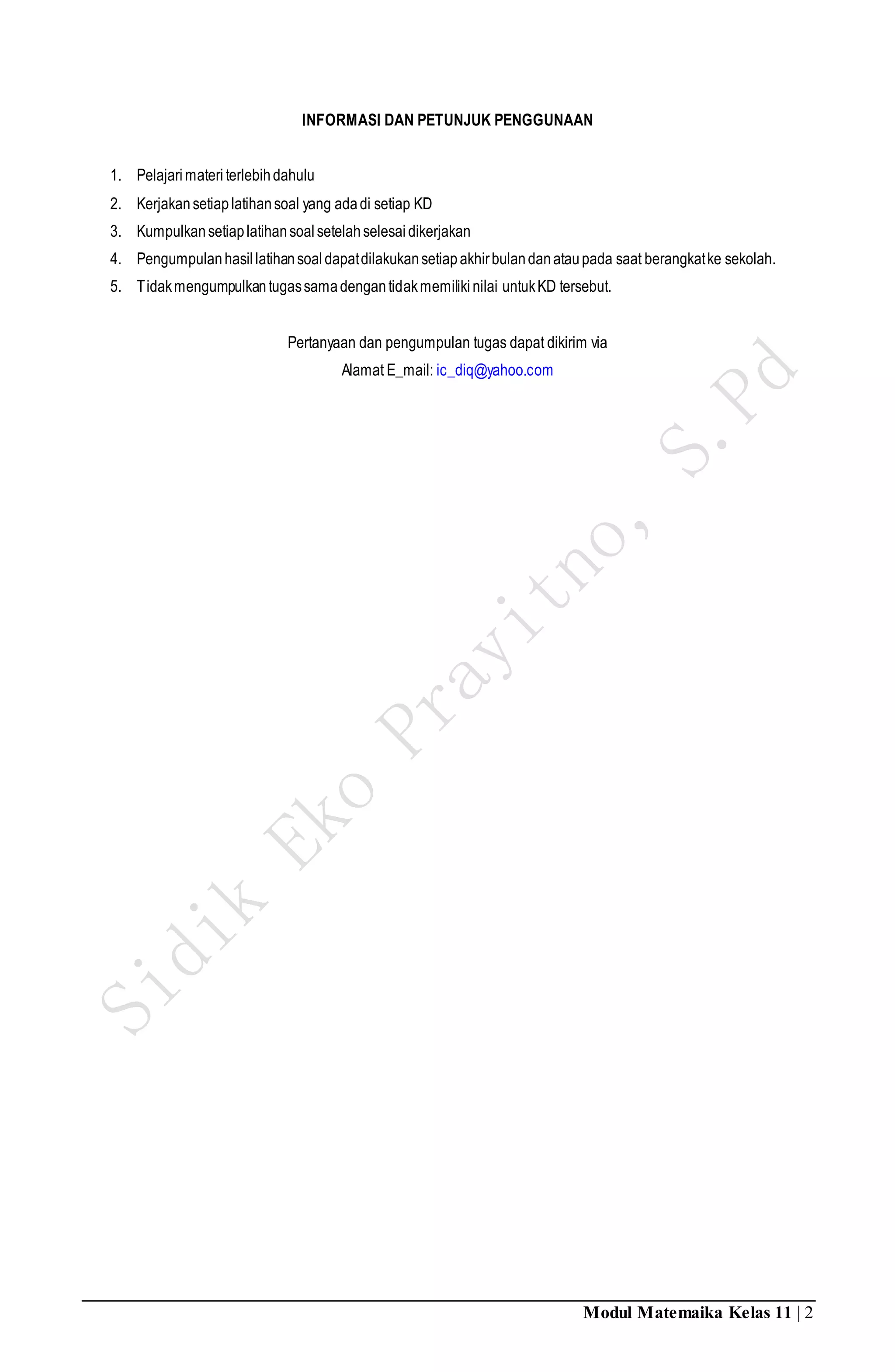Dokumen ini adalah modul matematika kelas 11 yang mencakup petunjuk penggunaan, kompetensi dasar, dan konsep dasar dalam logika matematika seperti pernyataan, negasi, konjungsi, disjungsi, dan implikasi. Siswa diminta untuk menyelesaikan latihan soal dan mengumpulkan hasil kerja mereka sesuai dengan petunjuk yang diberikan. Modul ini juga mencakup tabel kebenaran dan contoh pernyataan majemuk untuk latihan lebih lanjut.