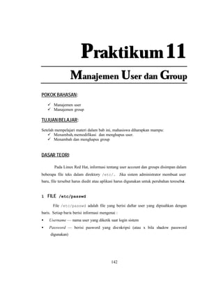 Dokumen tersebut membahas manajemen user dan group pada sistem operasi Linux Red Hat. Terdapat beberapa perintah untuk menambah, memodifikasi, dan menghapus user serta group. File-file seperti /etc/passwd dan /etc/group menyimpan informasi mengenai user dan group.