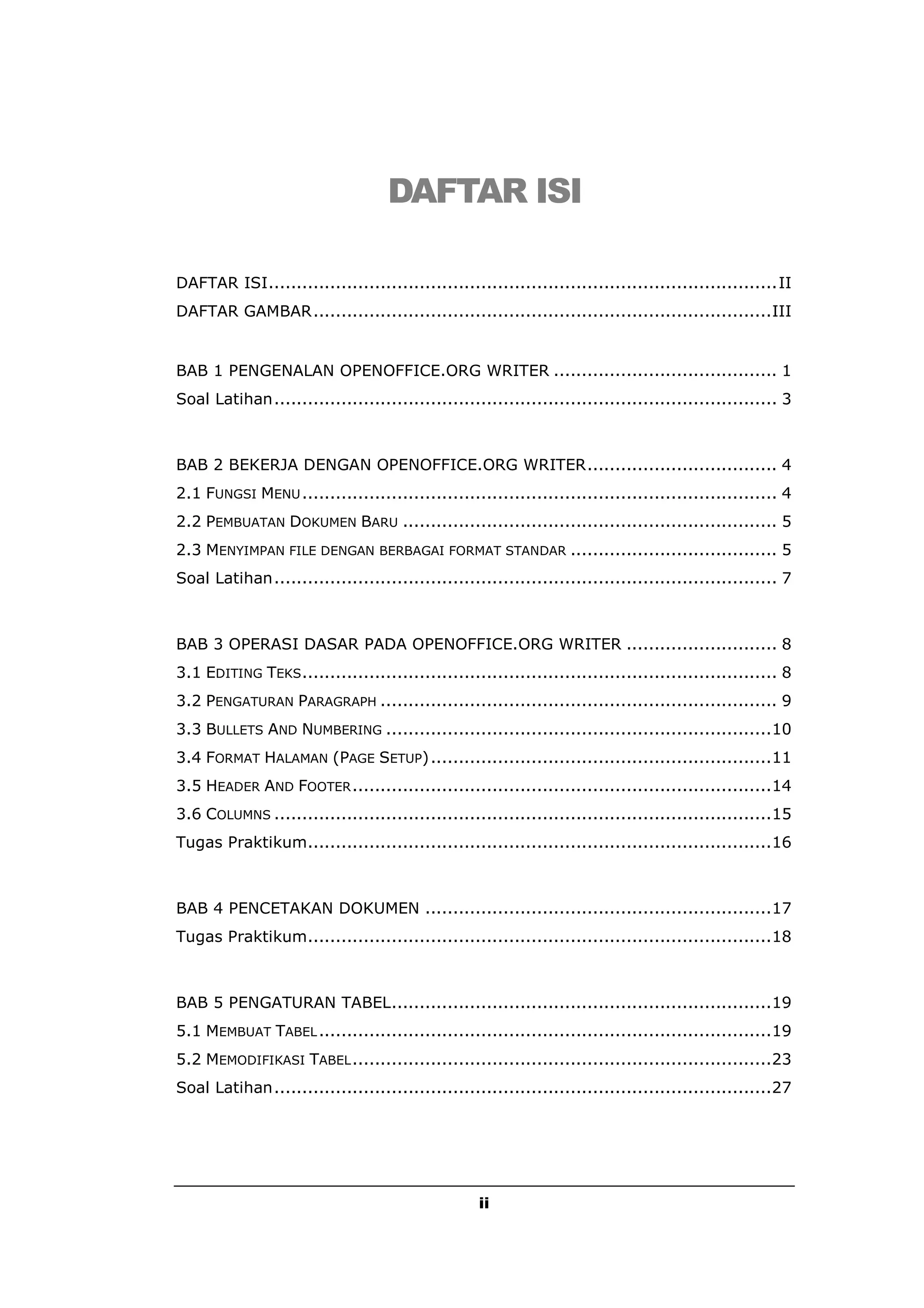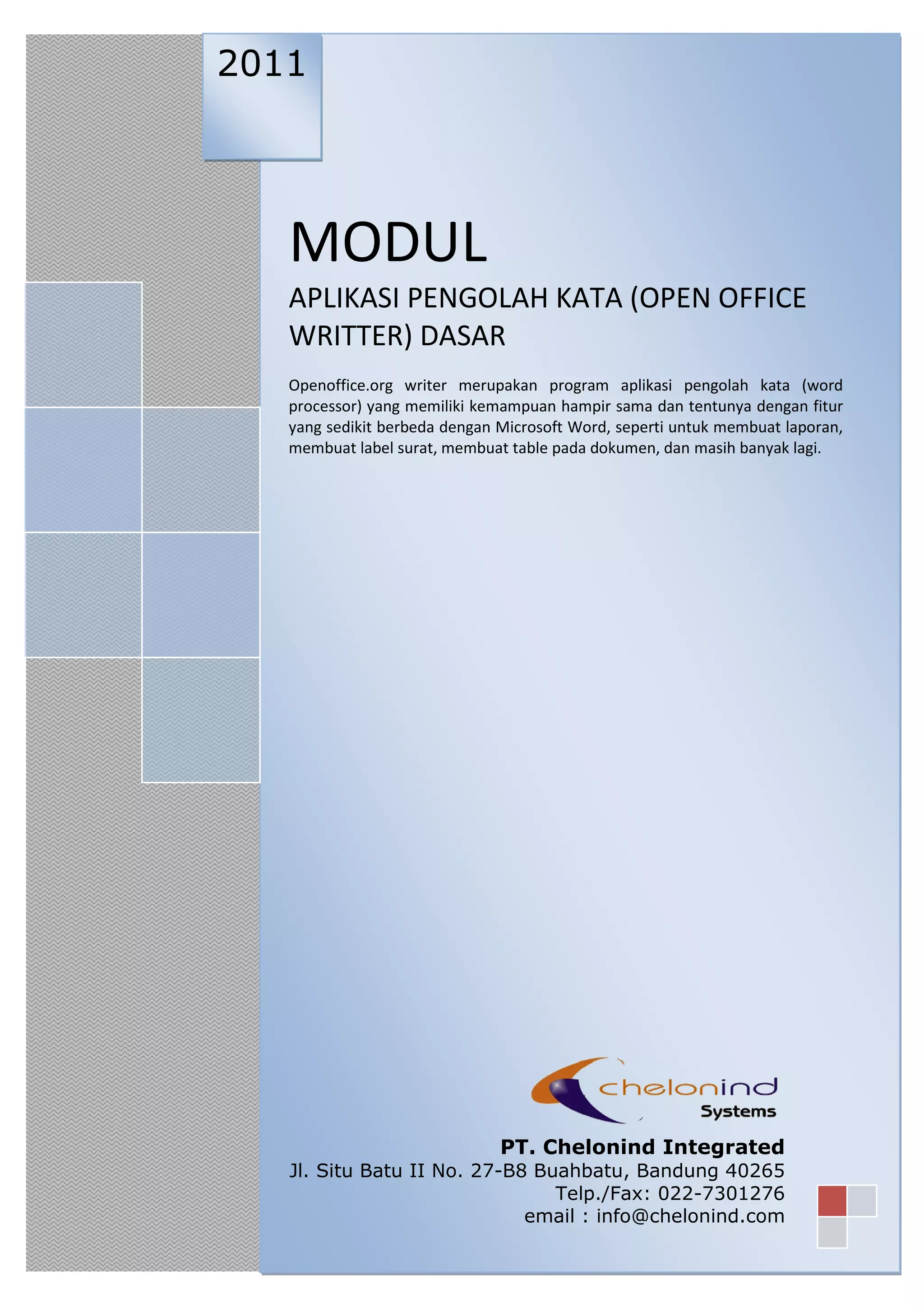 OpenOffice.org Writer merupakan program aplikasi pengolah kata yang memiliki kemampuan hampir sama dengan Microsoft Word. Modul ini membahas tentang pengenalan, pembuatan dokumen, penyimpanan file, editing teks, pengaturan paragraph, penambahan bullets dan numbering, format halaman, header dan footer, serta pengaturan tabel pada OpenOffice.org Writer.