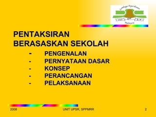 Dokumen ini membincangkan pelaksanaan Pentaksiran Berasaskan Sekolah (PBS) yang diperkenalkan pada tahun 2008, menetapkan prosedur dan tanggungjawab bagi sekolah dalam melaksanakan pentaksiran. PBS melibatkan kerja kursus dan pentaksiran lisan yang dilaksanakan oleh guru dan perlu memenuhi garis panduan yang ditetapkan oleh Lembaga Peperiksaan Malaysia. Mekanisme penyelarasan dan pemantauan juga digariskan untuk memastikan kesahan dan kebolehpercayaan hasil pentaksiran.