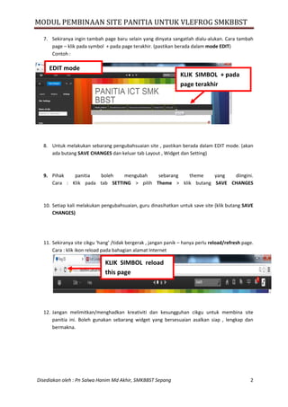 Dokumen ini adalah panduan untuk membina site panitia di VLEfrog SMKBBST yang disediakan oleh Pn. Salwa Hanim Md Akhir. Ia merangkumi langkah-langkah akses, pengubahsuaian, dan penggunaan widget dalam site panitia, termasuk jenis-jenis maklumat dan layout yang perlu ada dalam setiap page. Ditekankan juga tentang kreativiti dalam pembinaan serta kaedah untuk menyelamatkan perubahan dan mengatasi masalah yang mungkin timbul semasa penggunaan.