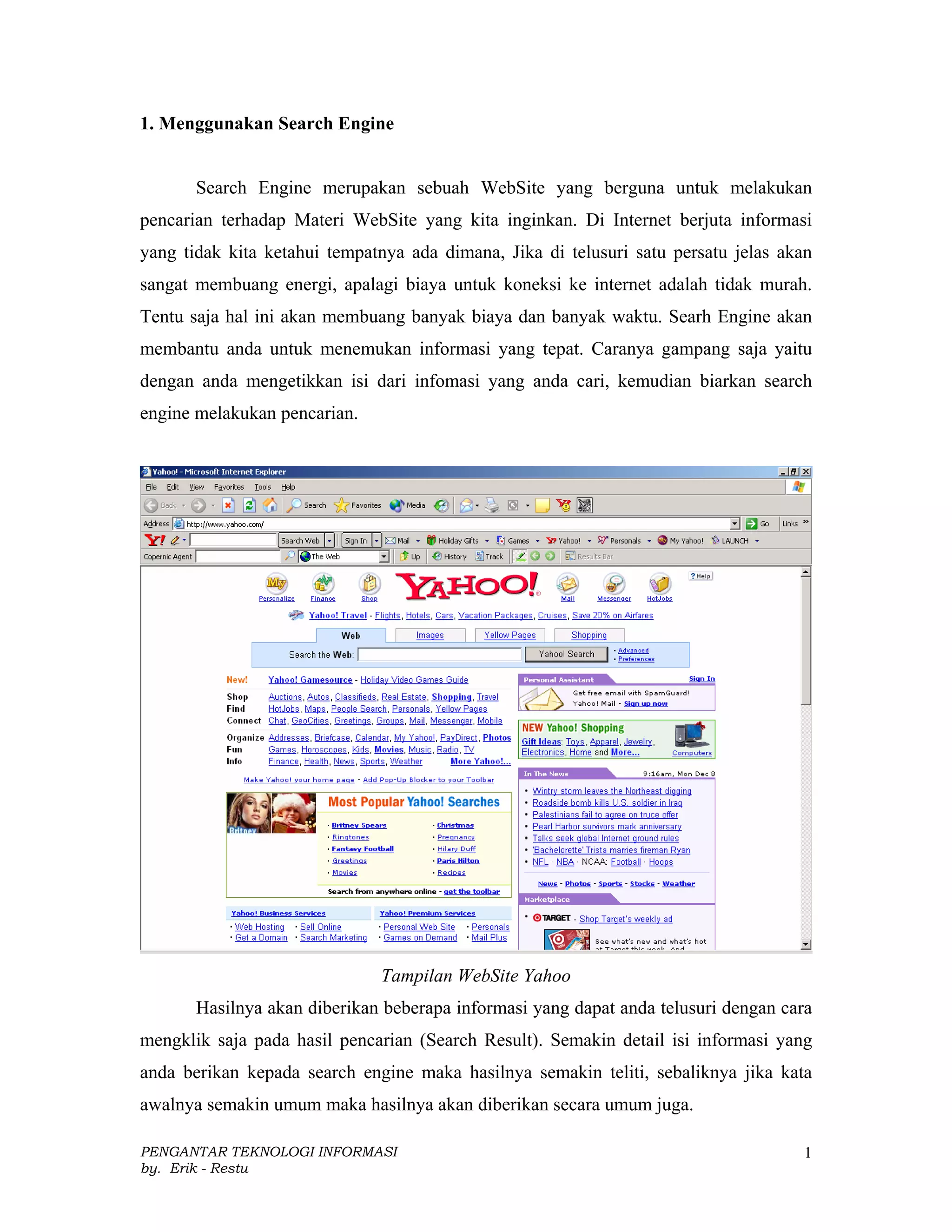 Dokumen ini memberikan panduan tentang penggunaan search engine, e-commerce, email, mailing list, dan komunikasi melalui IRC serta FTP. Setiap bagian menjelaskan konsep dasar, contoh platform, dan cara penggunaan layanan internet yang berbeda. Informasi ini diharapkan dapat membantu pengguna memahami dan memanfaatkan teknologi informasi secara efektif.