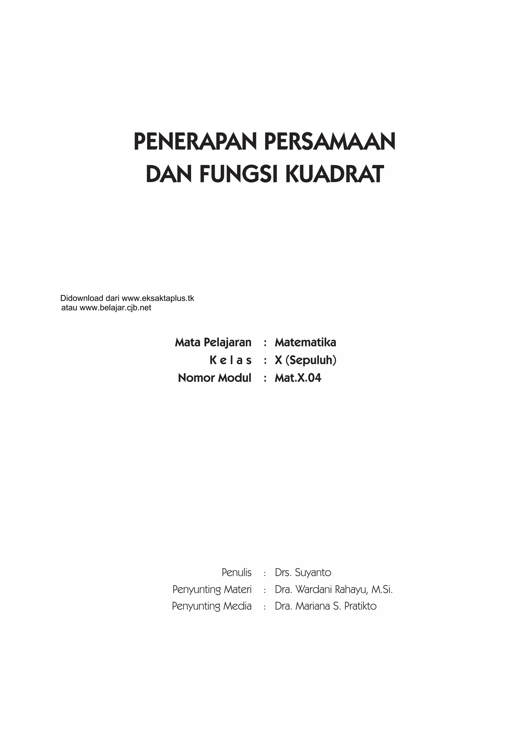 Modul ini membahas model matematika berupa persamaan kuadrat dan fungsi kuadrat yang terkait dengan berbagai permasalahan nyata. Persamaan kuadrat dapat merumuskan masalah yang mengandung operasi kuadrat dan bilangan, sementara fungsi kuadrat untuk masalah yang melibatkan hubungan antara dua variabel. Contoh soal dan penyelesaiannya membantu memahami proses merumuskan model matematika.