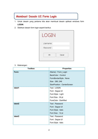 Dokumen ini memberikan panduan langkah demi langkah untuk membuat aplikasi peminjaman buku menggunakan Windows Forms, termasuk desain form untuk login, form utama, form buku, form peminjam, dan form pinjam buku. Setiap form dilengkapi dengan spesifikasi properti yang dibutuhkan seperti ukuran, jenis font, dan kontrol yang digunakan. Panduan juga mencakup cara menambahkan gambar pada toolbar dan berbagai tombol fungsional untuk aplikasi.