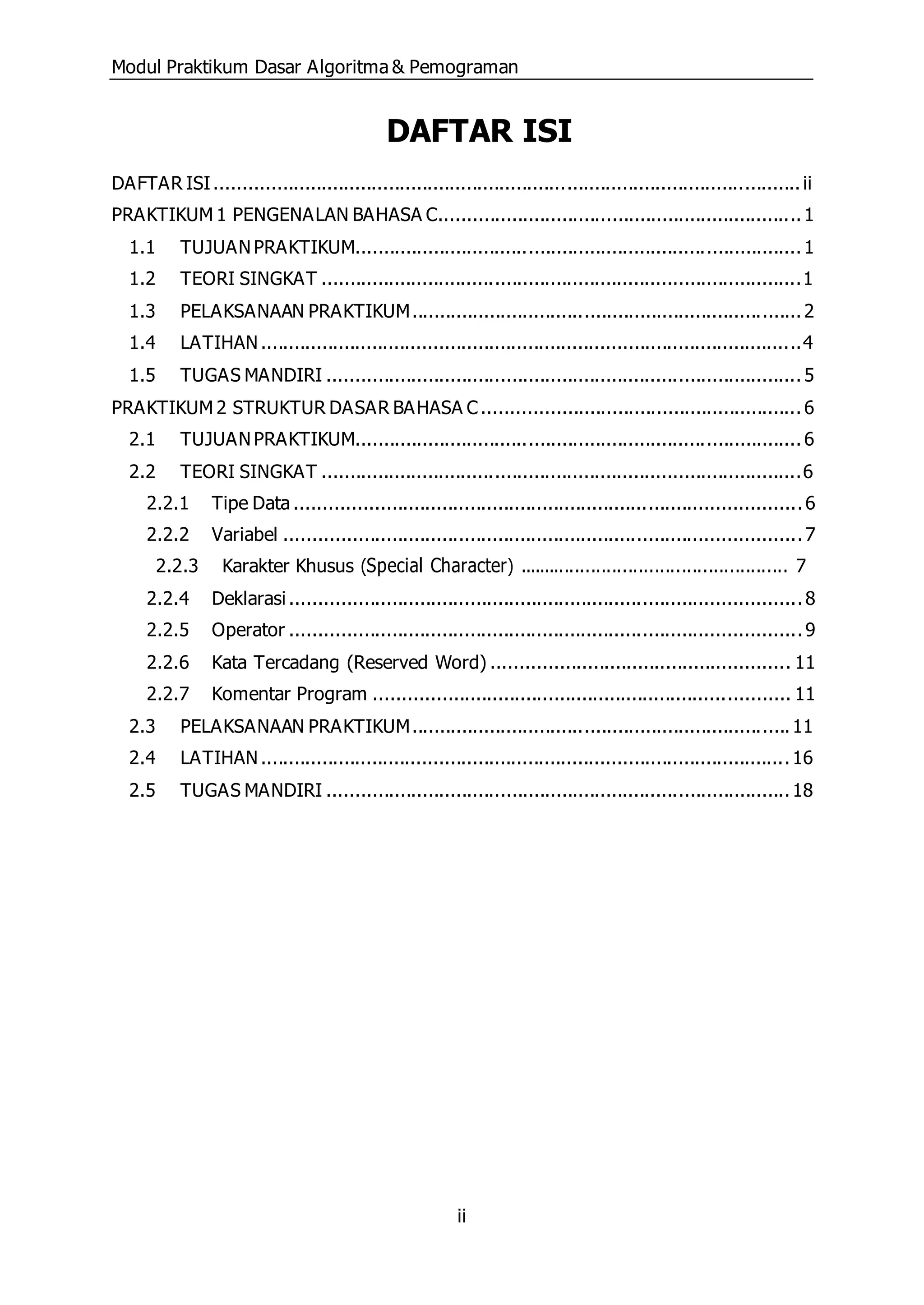 Dokumen ini adalah modul praktikum tentang dasar algoritma dan pemrograman, khususnya bahasa pemrograman C. Modul ini mencakup pengenalan, teori dasar, dan langkah-langkah praktikum beserta latihan dan tugas mandiri bagi mahasiswa teknik informatika. Poin-poin penting yang dibahas meliputi struktur dasar bahasa C, tipe data, variabel, serta berbagai operator dan fungsi dalam bahasa C.
