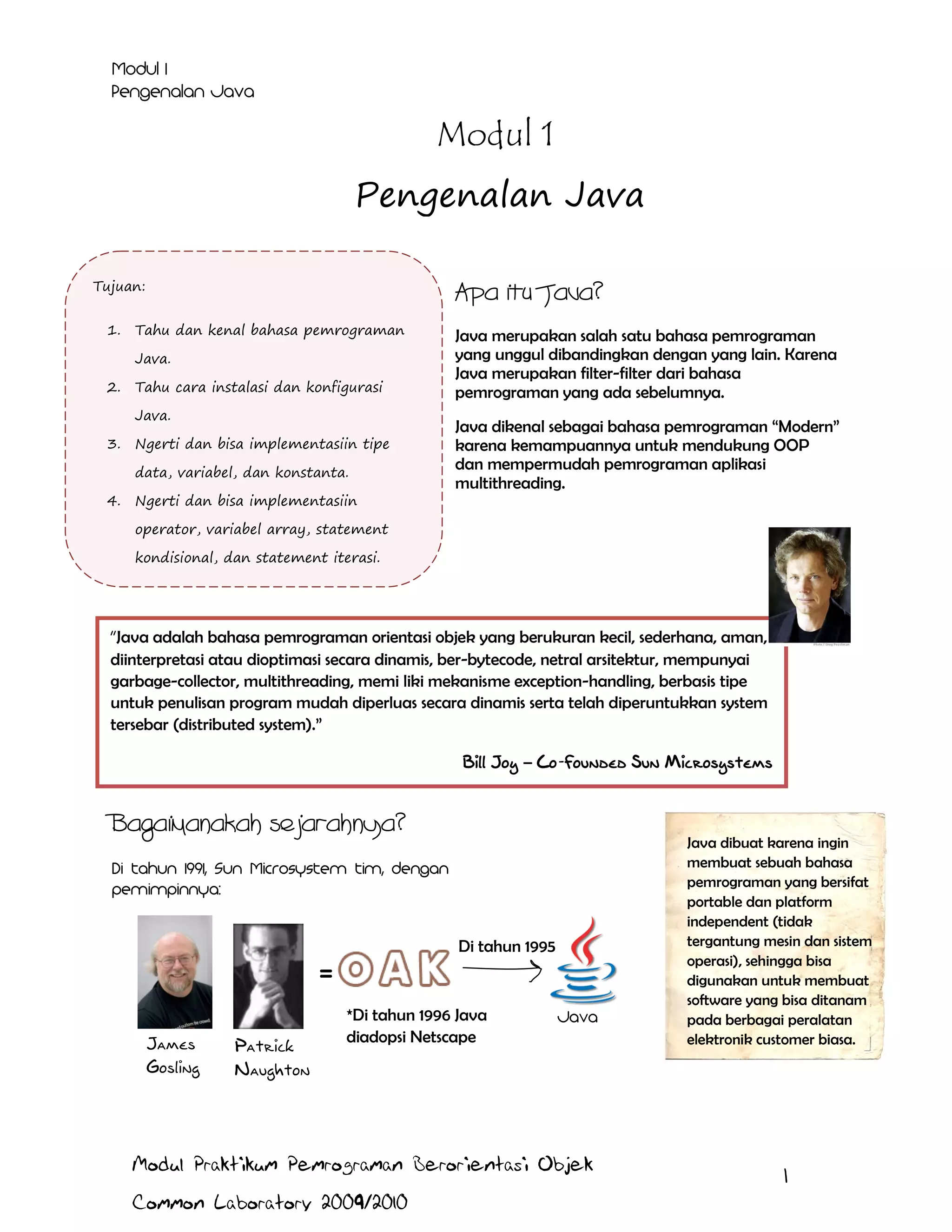 Modul ini membahas pengenalan Java, meliputi pengertian Java, sejarah, fitur-fitur, dan konsep dasar Java seperti tipe data, variabel, array, serta cara menginstal dan menjalankan program Java sederhana.