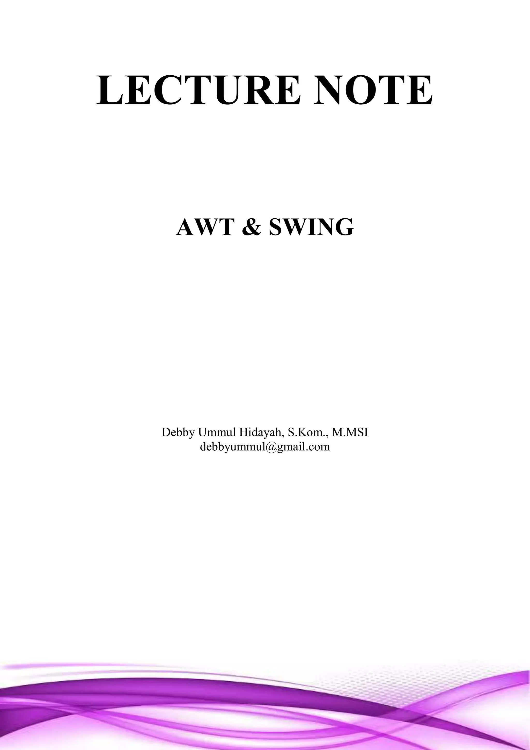 1. Dokumen tersebut membahas tentang pembuatan antarmuka grafis pengguna (GUI) menggunakan Abstract Window Toolkit (AWT) dan Swing dalam bahasa pemrograman Java.