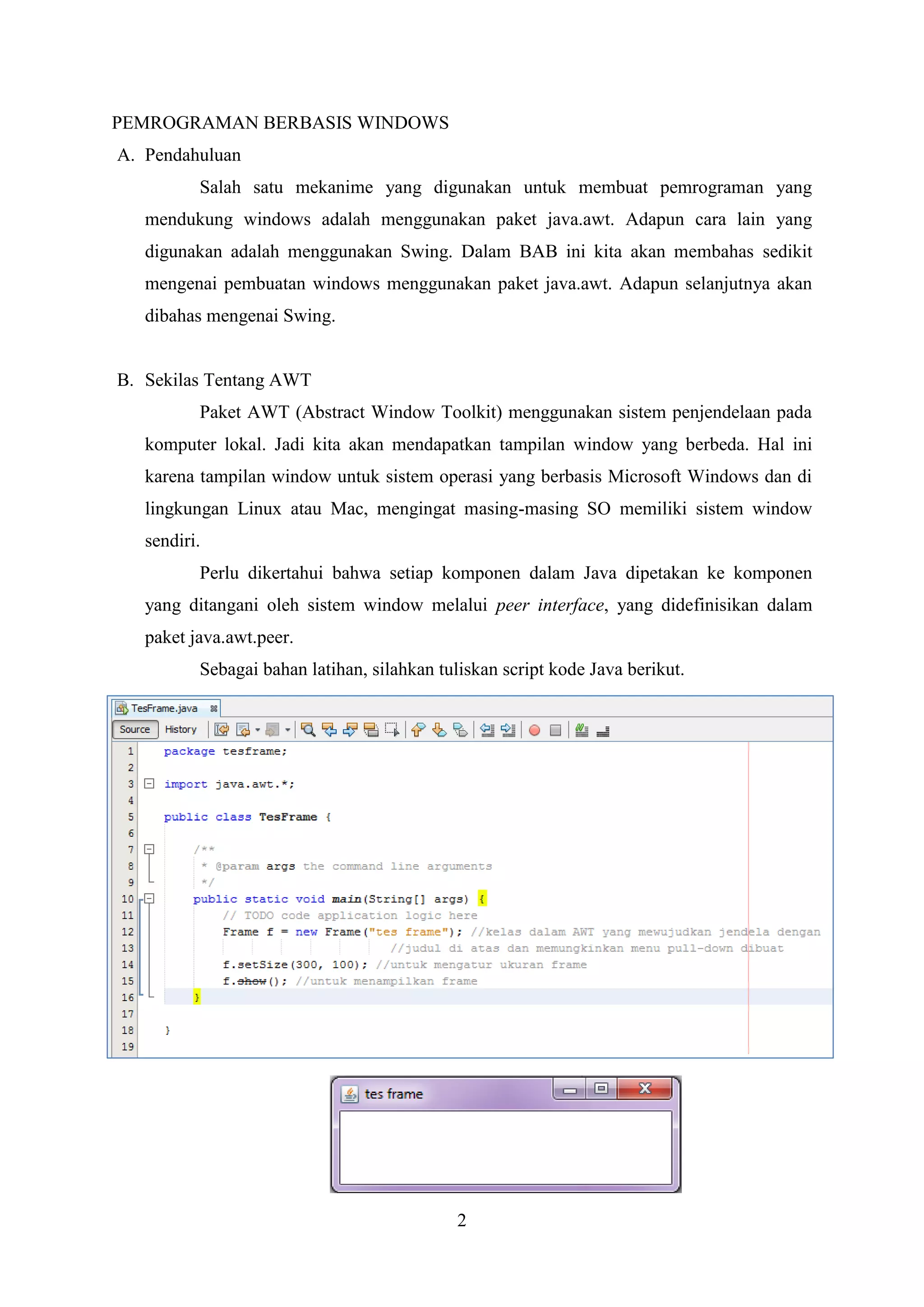 2. Terdapat penjelasan mengenai komponen-komponen GUI seperti frame, button, label, text field, combo box, check box, radio button beserta cara penggunaannya.