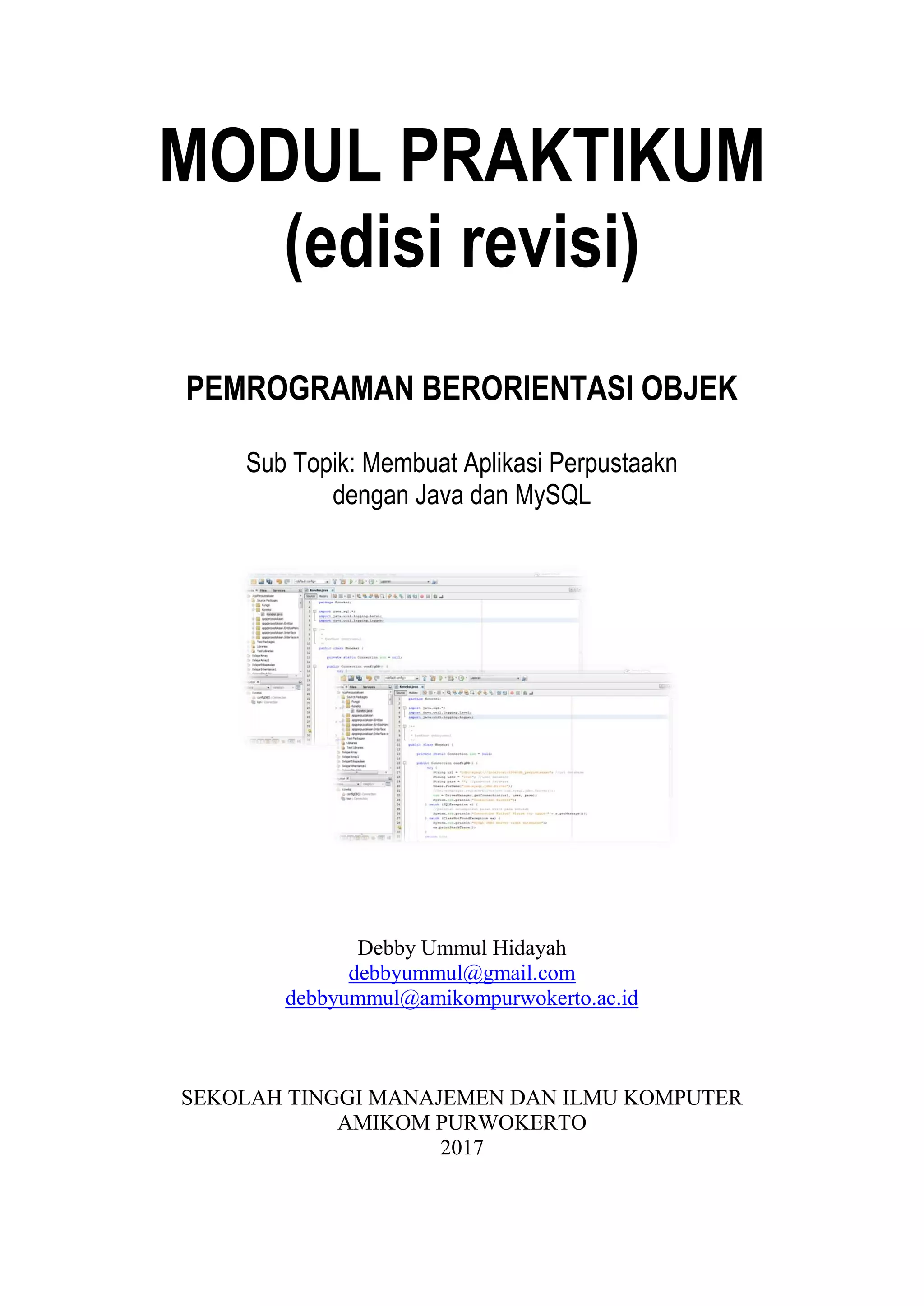 Dokumen ini adalah modul praktikum tentang pemrograman berorientasi objek untuk membuat aplikasi perpustakaan dengan Java dan MySQL. Terdapat langkah-langkah mulai dari mengimpor database MySQL, menambahkan library JDBC, membuat koneksi database, sampai implementasi kelas fungsi, entitas, dan antarmuka pengguna. Modul ini menyediakan instruksi terperinci beserta contoh kode untuk setiap langkah dalam pengembangan aplikasi.