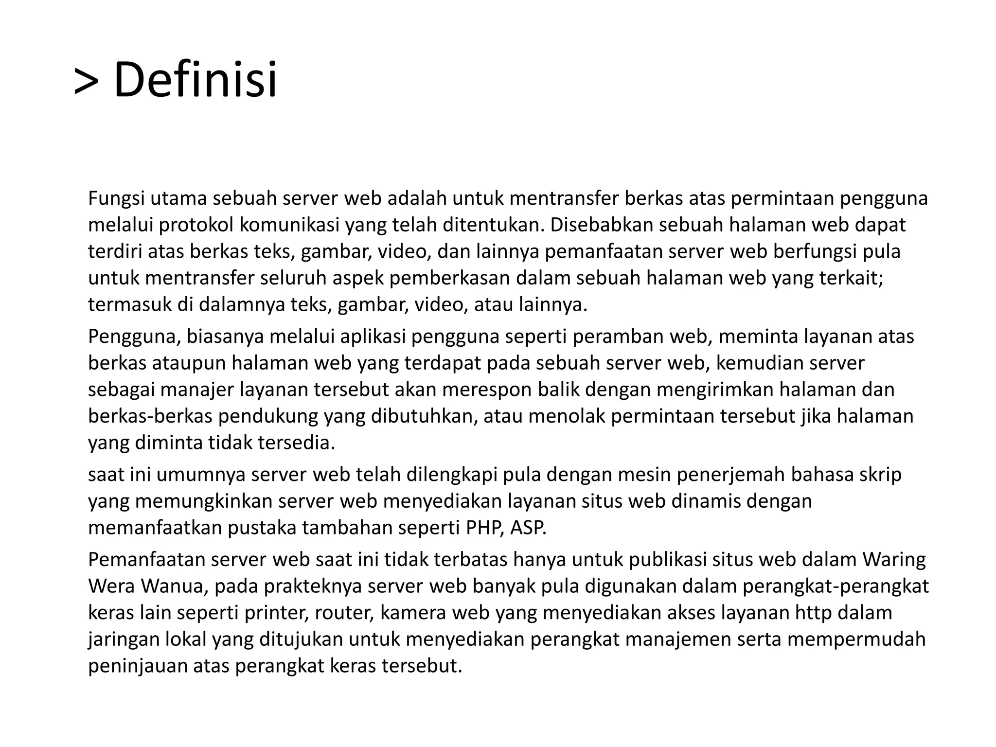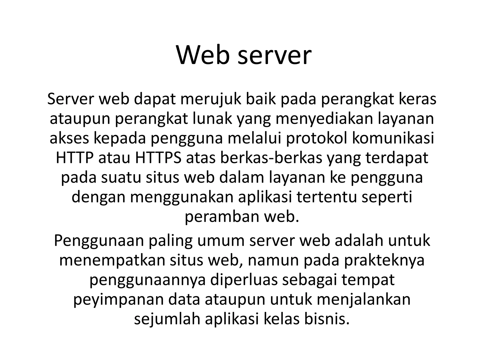 Server web merujuk pada perangkat keras atau lunak yang menyediakan akses ke berkas-berkas situs web melalui protokol HTTP atau HTTPS. Fungsi utamanya adalah mentransfer berkas berdasarkan permintaan pengguna. Saat ini server web sering dilengkapi dengan skrip bahasa untuk menyediakan layanan situs web dinamis.