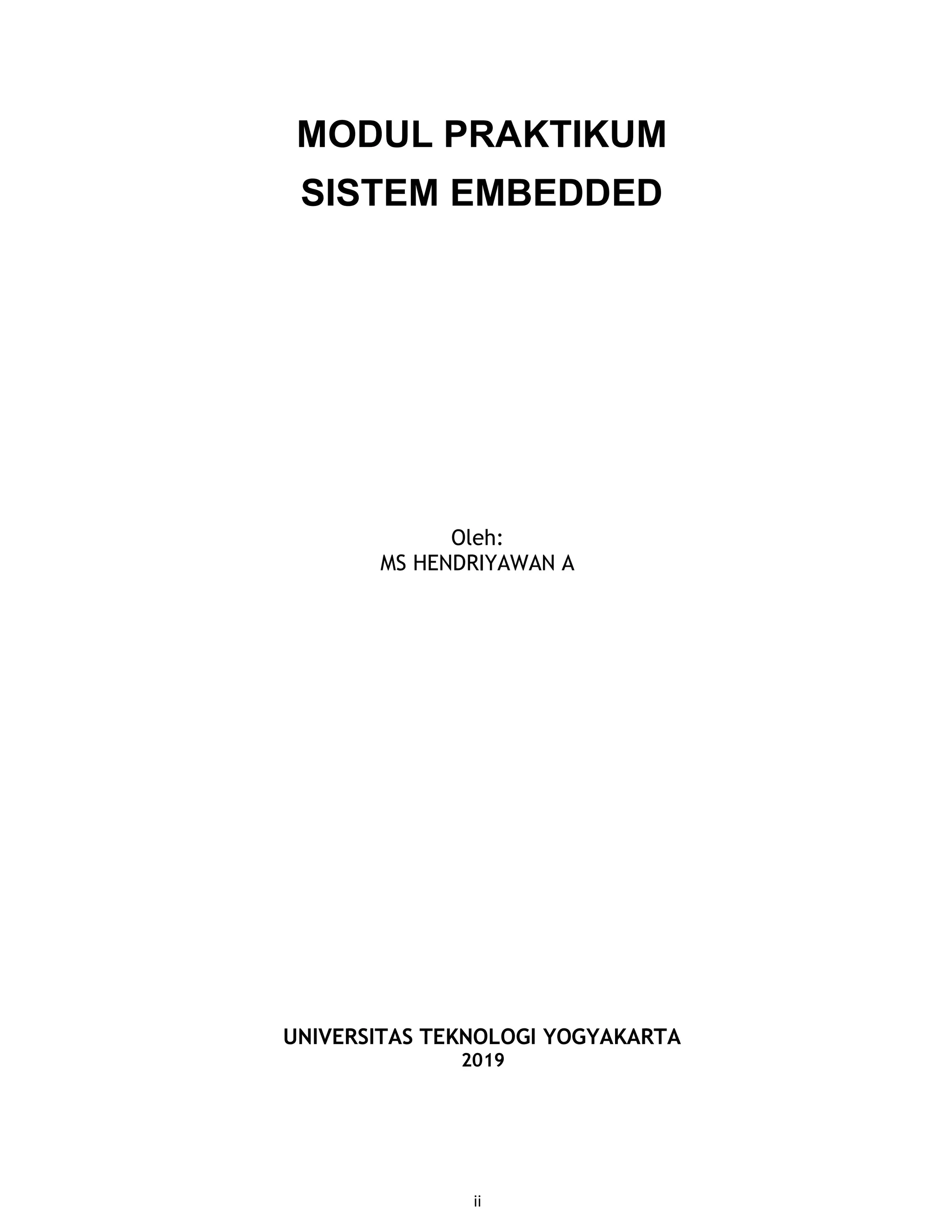 Modul praktikum sistem embedded oleh MS Hendriyawan A. dari Universitas Teknologi Yogyakarta membahas teknologi sistem benam yang mengintegrasikan perangkat keras dan perangkat lunak terprogram, termasuk aplikasi berbasis Arduino. Modul ini dirancang untuk membantu mahasiswa memahami konsep pengembangan sistem benam dan menerapkan tekniknya, terutama dalam konteks industri 4.0. Terdapat beberapa topik yang dibahas dalam modul ini, seperti antarmuka masukan/keluaran, komunikasi digital, dan pemrograman menggunakan Arduino IDE.