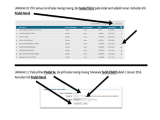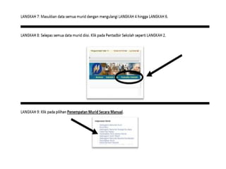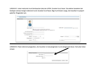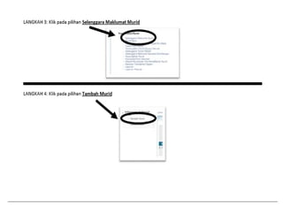 Dokumen ini menjelaskan langkah-langkah pendaftaran murid baharu di SMK Taman Johor Jaya 2 ke dalam sistem pengurusan sekolah. Pengguna diingatkan bahwa sistem masih belum stabil dan perlu memastikan data murid di sistem APDM tepat sebelum pendaftaran. Untuk bantuan teknikal, guru dapat merujuk kepada Maria Azma binti Salleh atau Noor Shazeren binti Abdullah.