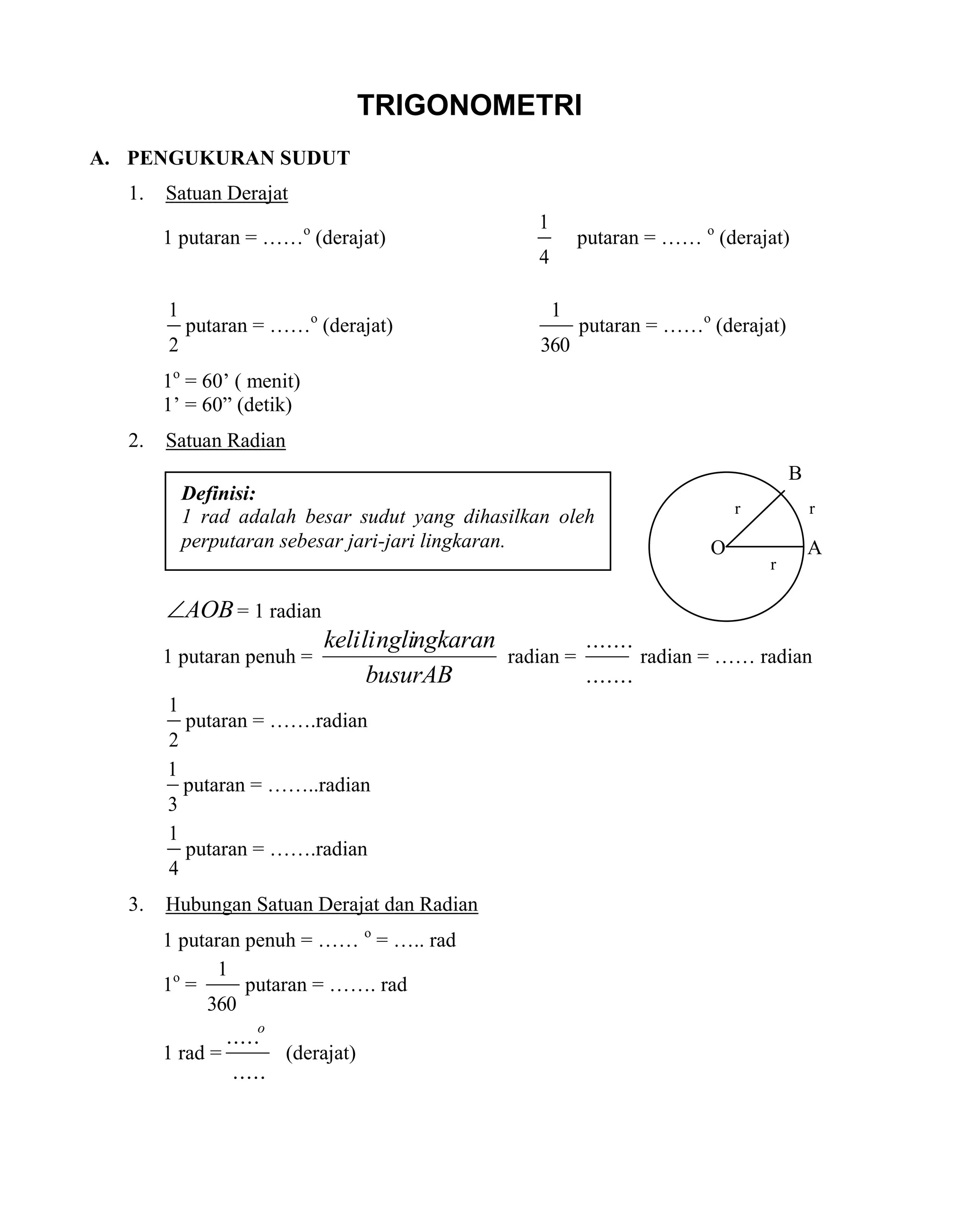 Dokumen ini membahas konsep dasar trigonometri, termasuk pengukuran sudut dalam derajat dan radian serta perbandingan trigonometri pada segitiga siku-siku. Terdapat penjelasan mengenai identitas trigonometri, sudut berelasi, serta penerapan trigonometri dalam soal-soal. Selain itu, dokumen ini juga menyajikan latihan dan metode penyelesaian masalah trigonometri, termasuk aturan sinus dan kosinus untuk segitiga.
