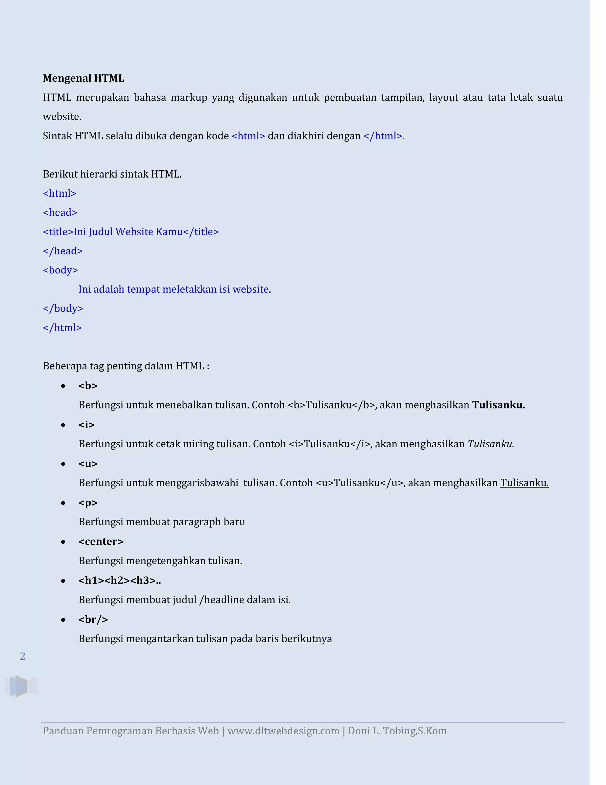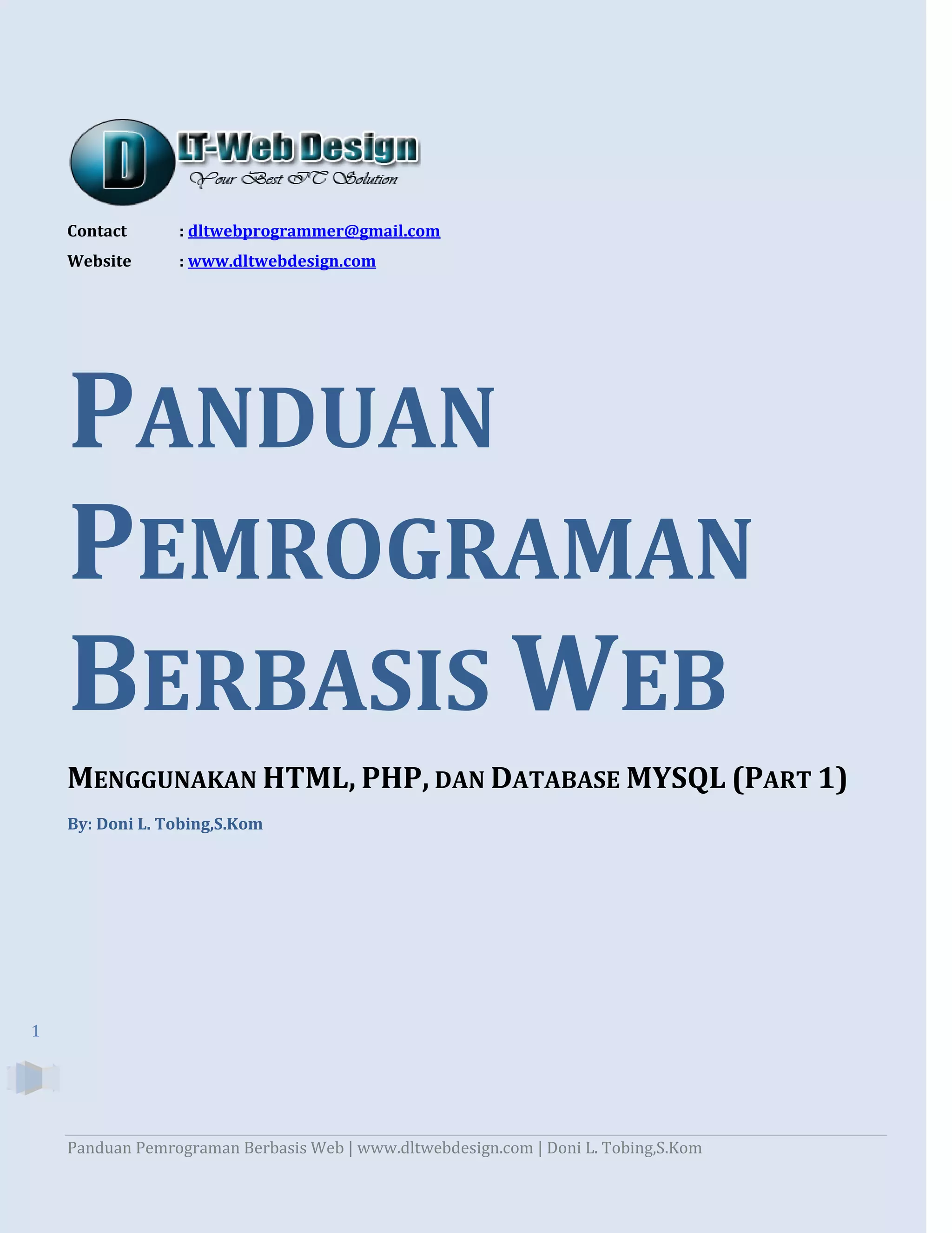 Dokumen ini adalah panduan pemrograman berbasis web yang menjelaskan penggunaan HTML, PHP, dan MySQL. Penulis menguraikan dasar-dasar HTML, sintaks PHP, dan pengoperasian database MySQL termasuk cara membuat tabel dan menjalankan query. Tutorial ini bertujuan untuk membantu pembaca memahami cara menghubungkan aplikasi web dengan database dan memanipulasi data.