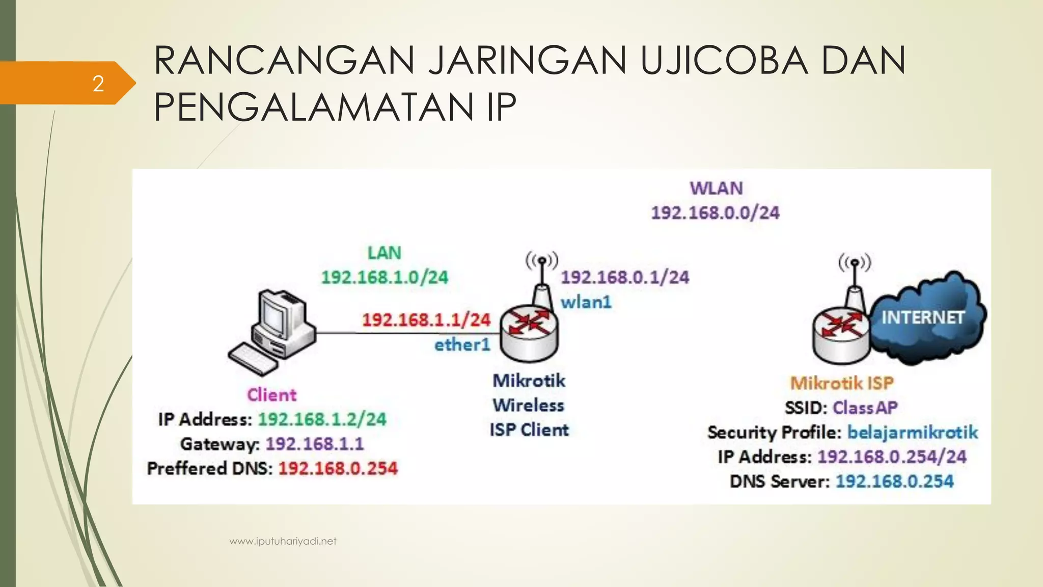 Dokumen ini menjelaskan langkah-langkah konfigurasi jaringan menggunakan MikroTik yang mencakup pengaturan koneksi internet, NAT untuk berbagi koneksi, pengaktifan hotspot, dan konfigurasi VPN menggunakan PPTP. Proses tersebut meliputi pengaturan alamat IP, pembuatan profil keamanan wireless, serta pengujian konektivitas dari klien LAN ke internet. Dokumentasi juga mencakup cara mengakses layanan HTTP dari internet ke server lokal dan pengaturan pengguna VPN.