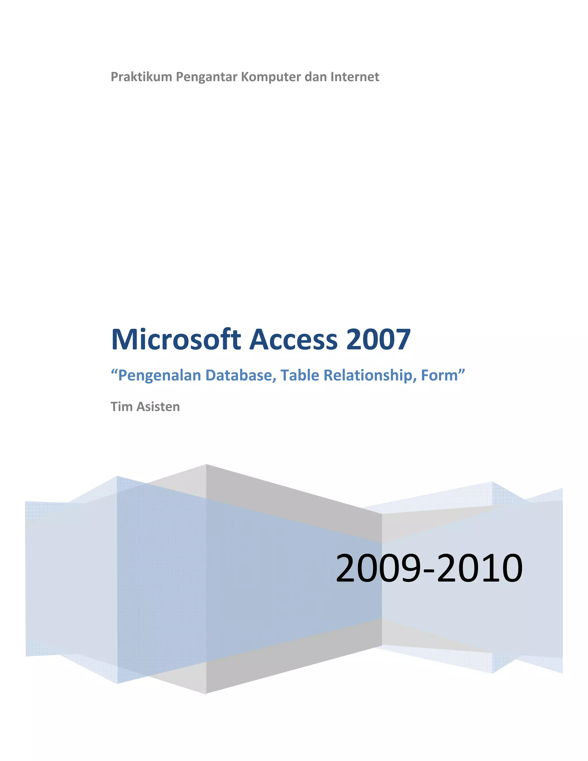 Dokumen ini menjelaskan tentang Microsoft Access 2007 sebagai aplikasi basis data relasional, termasuk pengenalan komponen dan cara membuat database, tabel, form, serta relasi antar tabel dengan penjelasan mengenai primary key dan foreign key. Terdapat langkah-langkah praktis untuk membuka Microsoft Access, membuat tabel, dan menghubungkan tabel melalui relationship, serta beberapa latihan praktis untuk memahami konsep tersebut. Selain itu, dokumen ini memberikan studi kasus mengenai pembuatan sistem informasi registrasi mahasiswa yang terintegrasi dengan pengelolaan data matakuliah dan dosen.