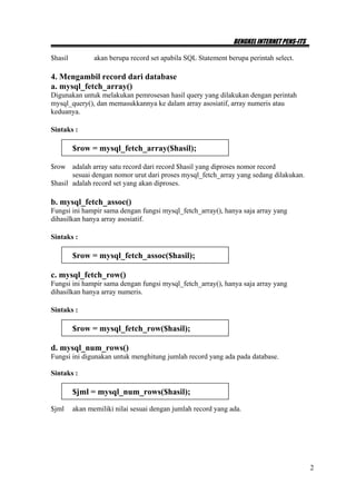 Dokumen ini menjelaskan langkah-langkah untuk menghubungkan PHP dengan MySQL, termasuk membuka koneksi, memilih database, dan mengambil data menggunakan berbagai metode seperti mysql_fetch_array(), mysql_fetch_assoc(), dan mysql_fetch_row(). Selain itu, dokumen ini memberikan contoh kode HTML dan PHP untuk membuat database, form buku tamu, serta fungsionalitas pencarian. Terdapat juga latihan untuk memahami perbedaan fungsi pengambilan data serta memproses dan menampilkan data dari database.