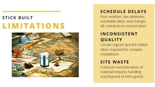 Modular buildings consist of prefabricated rooms or sections that are constructed off-site and assembled on-site. They offer advantages like less waste, lower costs, safer construction, and shorter build times compared to conventional methods. The Dean 461 apartment building in Brooklyn is an example of a modular high-rise consisting of 32 stories and 363 pre-fab apartment blocks. While modular construction has advantages, it also has some disadvantages such as potential transport difficulties with large modules and an unconventional aesthetic.