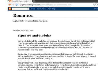Modular Module Systems: a survey discusses different approaches to modularity in programming languages. It covers modules as a way to separate compilation, manage namespaces, and hide/abstract types and values. Different languages take different approaches, from separate files in C to more robust modules in ML and Haskell that allow nesting, signatures, functors, and type classes. The document uses examples from C, C++, ML, Haskell to illustrate how modules have evolved to support separate compilation, abstraction, and reuse through mechanisms like functors and signatures.