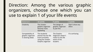 Students are required to select a graphic organizer to illustrate a life event and will be evaluated on creativity, appeal, and compatibility with their chosen event. Each student will present their organizer in class, which should effectively convey their ideas. Proper use and design of the graphic organizer are crucial for successful communication of their life experiences.