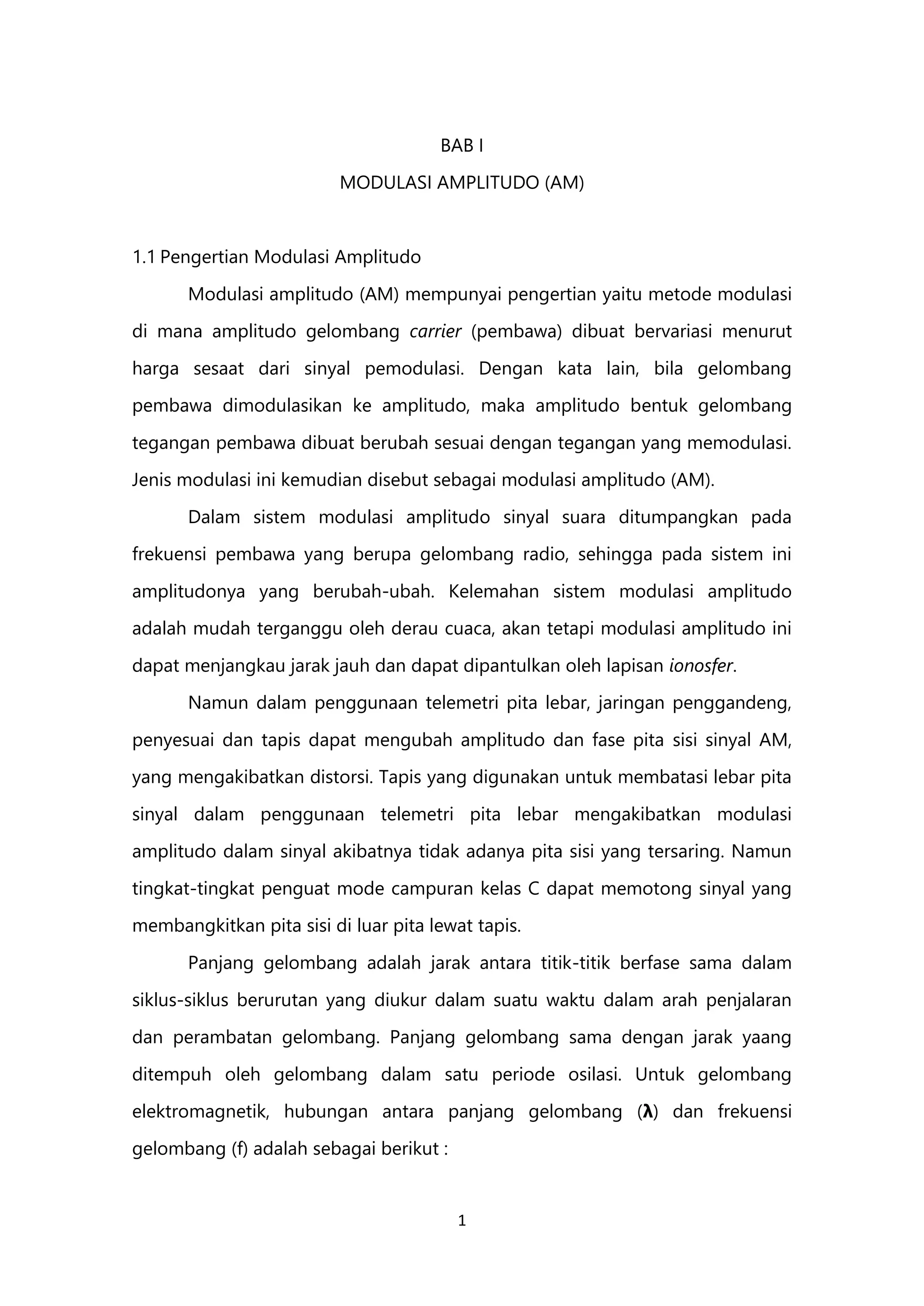 Dokumen tersebut membahas tentang modulasi amplitudo (AM) dan modulasi frekuensi (FM). Modulasi AM memodulasi amplitudo gelombang pembawa sesuai sinyal informasi, sementara modulasi FM memodulasi frekuensi gelombang pembawa. Dokumen ini juga menjelaskan komponen-komponen penerima radio AM dan FM serta frekuensi yang digunakan dalam siaran radio AM dan FM.