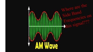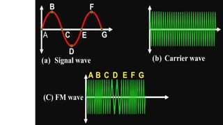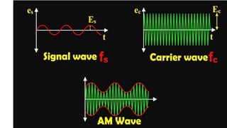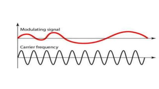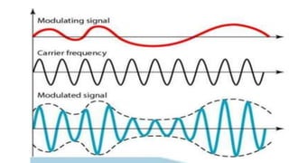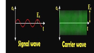 The document discusses modulation techniques. Modulation involves imposing information onto a carrier signal by varying its amplitude, frequency, or phase. Specifically, it describes amplitude modulation where the amplitude of the carrier wave is varied proportionally to the amplitude of the message signal. It provides the mathematical representations of the carrier and message signals and how they are multiplied to generate the modulated signal. It also discusses uses of amplitude modulation in applications like air band radio.