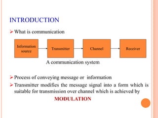 This document discusses amplitude modulation (AM) as a type of modulation used to transmit information signals. Modulation involves varying a high frequency carrier signal by an information signal in order to transmit the information signal over long distances. In AM, the amplitude of the carrier signal is varied in accordance with the instantaneous amplitude of the modulating or information signal. This creates two new sideband frequencies above and below the carrier frequency equal to the modulation frequency. The carrier and sidebands together make up the modulated signal. Only a portion of the transmitted power is present in the sidebands containing the information, while the rest is wasted in the carrier.