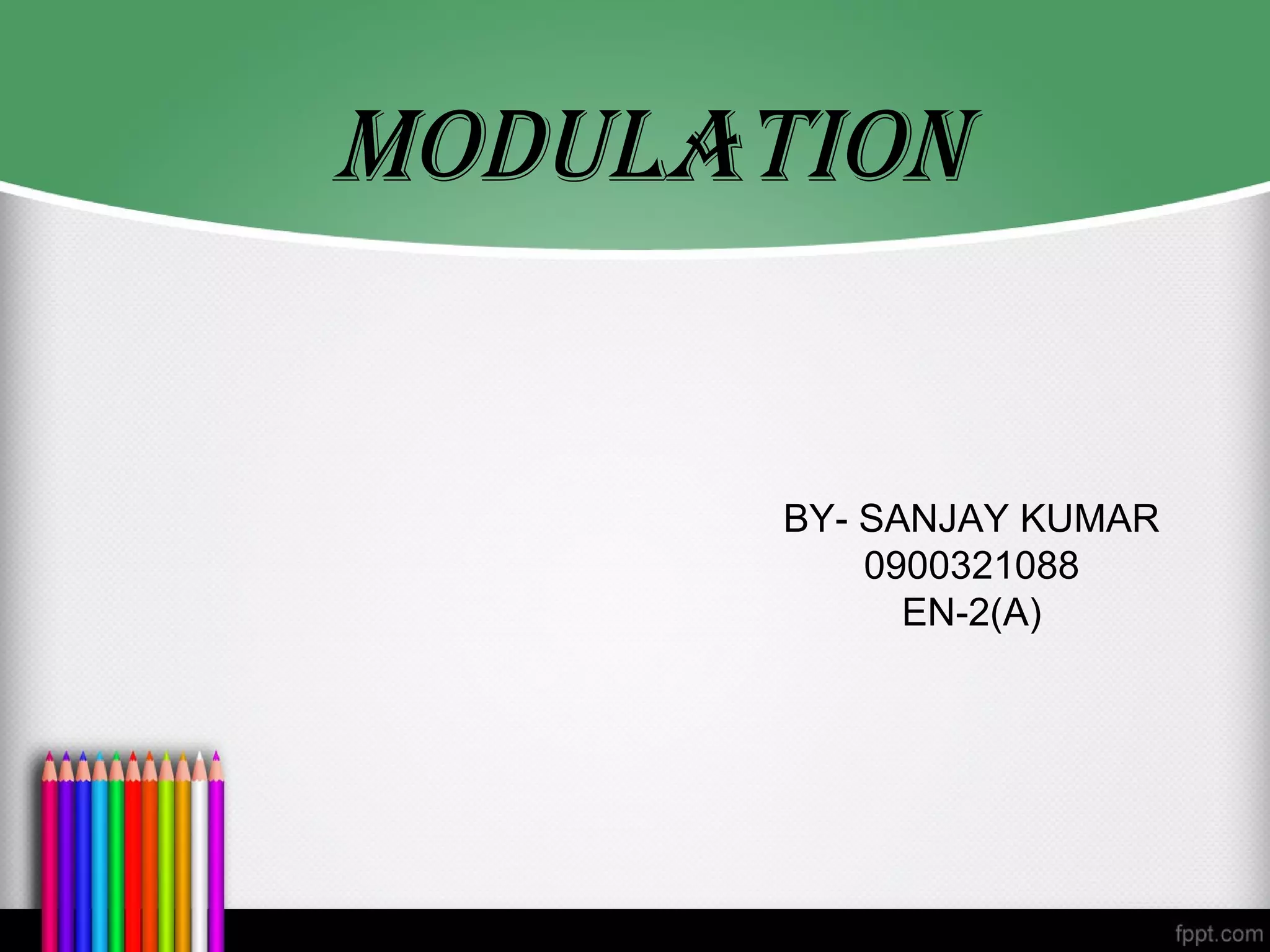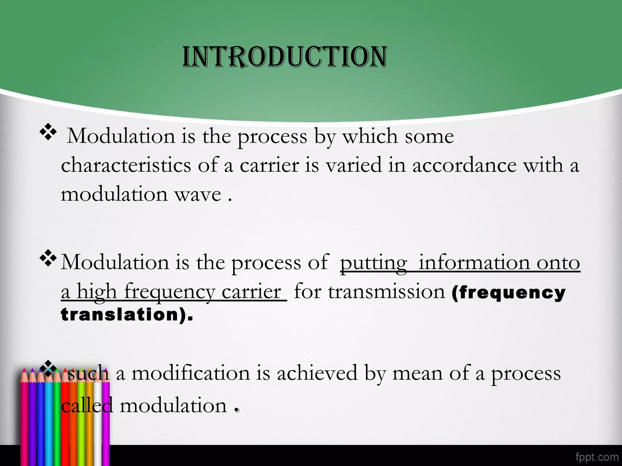 The document discusses modulation and amplitude modulation. It defines modulation as varying characteristics of a carrier signal in accordance with a modulation wave. Amplitude modulation varies the amplitude of a carrier signal proportionally to the instantaneous value of a modulating signal. The amplitude modulated signal is made up of the carrier signal, modulating signal, and sidebands containing the information. The modulation index indicates the ratio between the modulating signal and carrier amplitudes. Amplitude modulation has applications in broadcasting and communications.