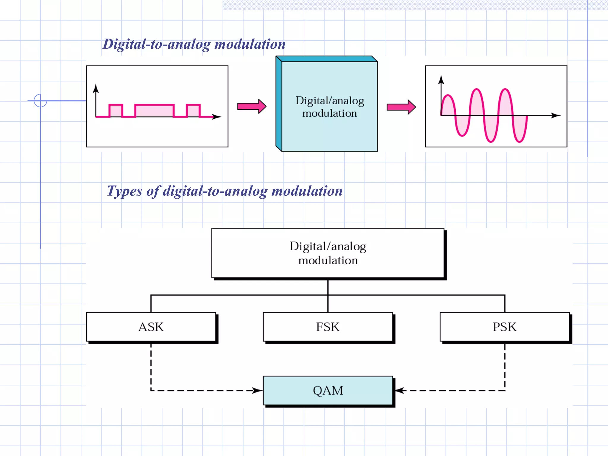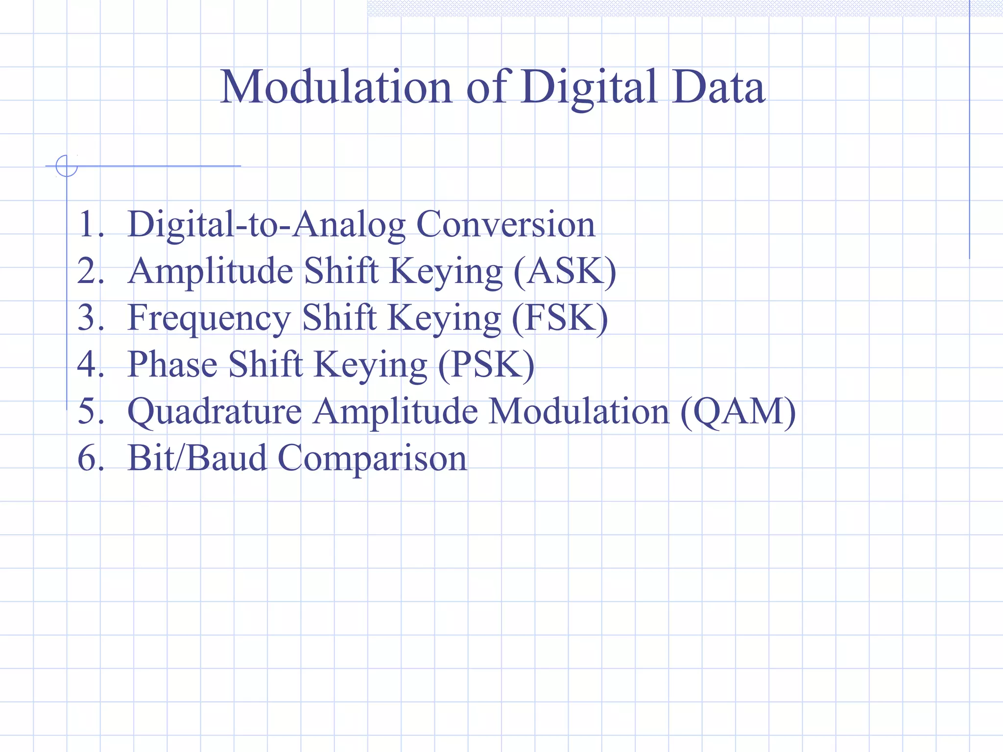 The document covers various methods of digital-to-analog modulation, including amplitude shift keying (ASK), frequency shift keying (FSK), phase shift keying (PSK), and quadrature amplitude modulation (QAM). It explains the relationship between baud rate and bit rate, illustrating how data transmission rates are impacted by modulation techniques. Additional details include the susceptibility of each method to noise and the bandwidth requirements for effective signal transmission.