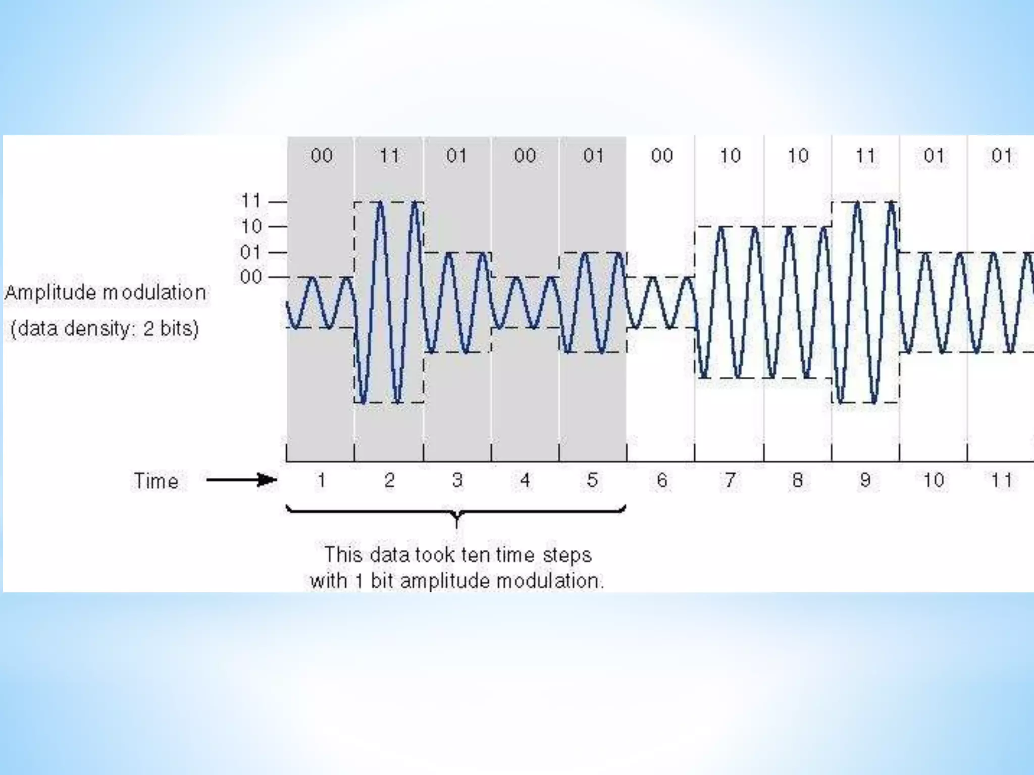 - Quadrature Amplitude Modulation (QAM) which combines ASK and PSK to send multiple bits per symbol.