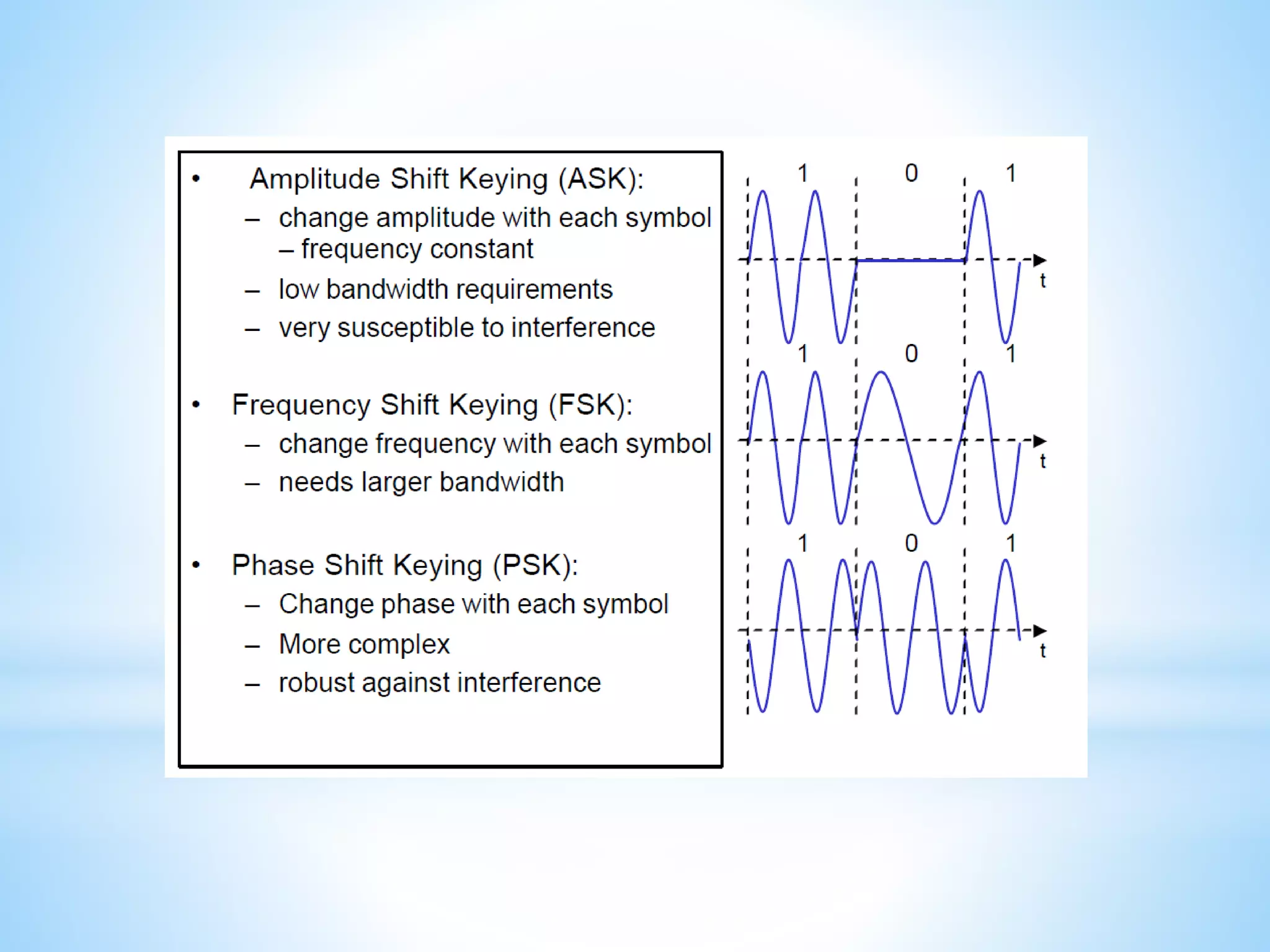 - Frequency Shift Keying (FSK) which represents data as changes in carrier frequency.