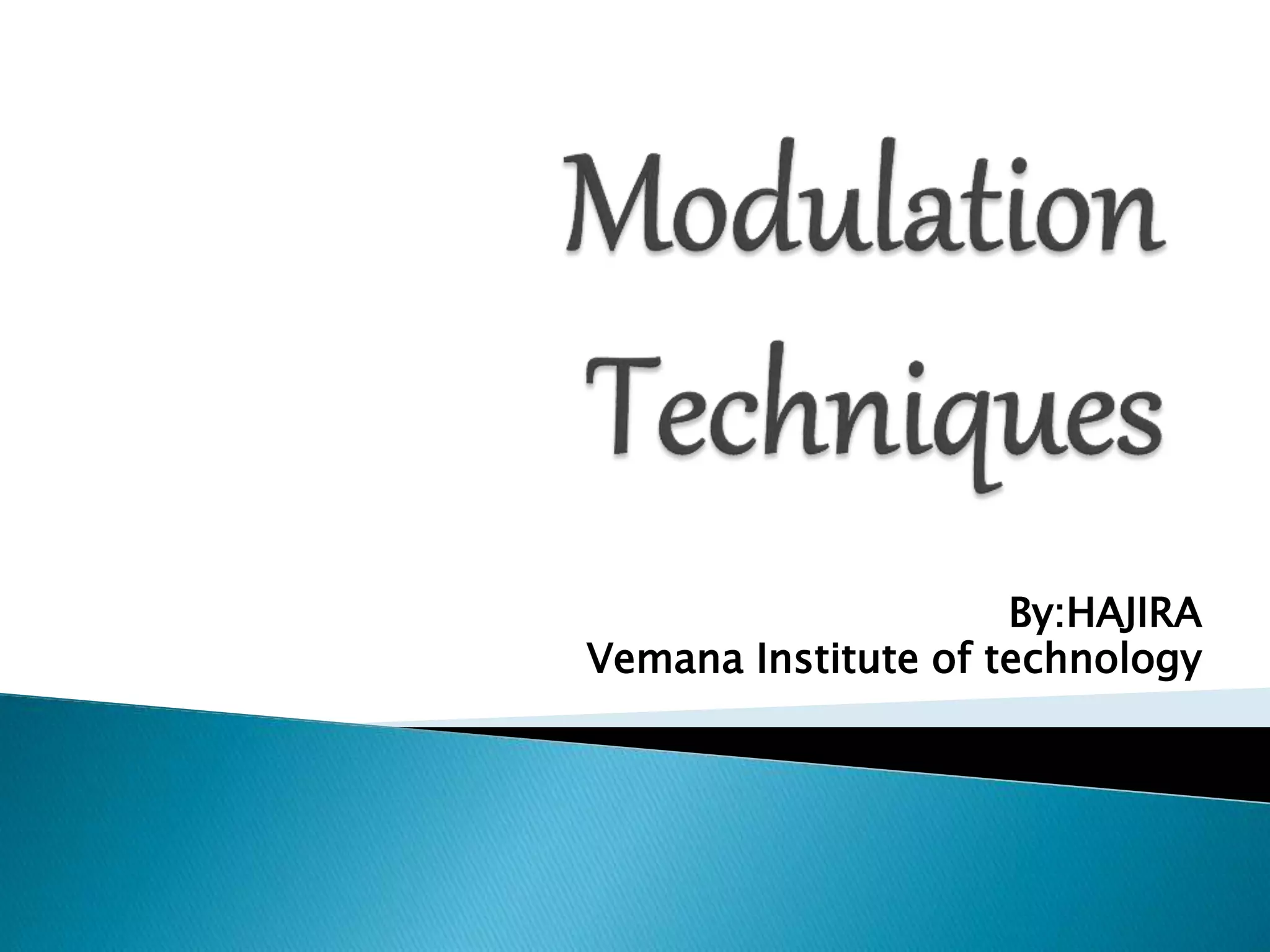 This document discusses different types of modulation techniques used in electronics and telecommunications. It begins by defining modulation as the process of varying a carrier signal in accordance with a message signal in order to reduce antenna size and interference. It then describes analog modulation techniques including amplitude modulation, frequency modulation, and phase modulation. The document also covers digital modulation techniques like amplitude shift keying, phase shift keying, frequency shift keying, and quadrature amplitude modulation. It highlights how quadrature amplitude modulation is commonly used in radio communication due to its ability to carry high data rates.