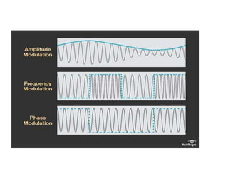 Modulation is the process of encoding information onto a carrier signal by varying its amplitude, frequency, phase or other properties. This allows the signal to be transmitted efficiently over long distances. Common modulation types include amplitude modulation (AM), frequency modulation (FM) and phase modulation (PM). Modulation is used in radio, television, Wi-Fi and other wireless communications to transmit data or audio on an electromagnetic carrier wave.