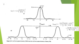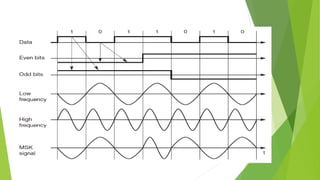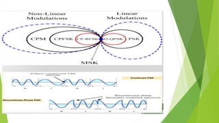 This document discusses digital modulation techniques used in modern mobile communication systems. It explains that digital modulation translates digital data into analog signals and provides advantages over analog transmission like greater noise immunity and easier multiplexing. Key factors that influence the choice of digital modulation scheme are low bit error rates, performance in fading environments, minimum bandwidth usage, and cost-effective implementation. Modulation techniques are evaluated based on their power efficiency and bandwidth efficiency. Power efficiency is defined as preserving signal fidelity at low signal-to-noise ratios, while bandwidth efficiency is utilizing the allocated bandwidth to maximize data throughput.