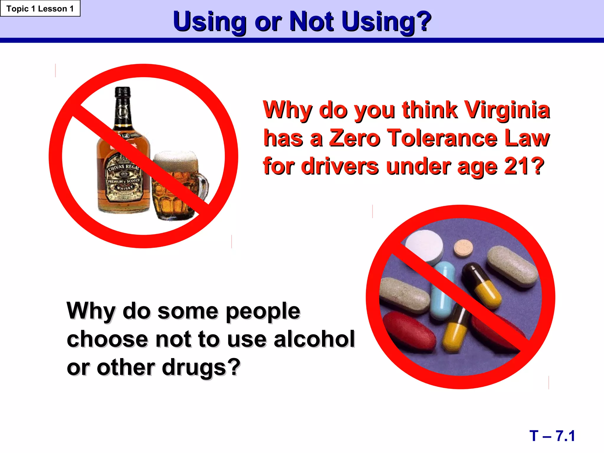This document discusses driver performance and the effects of alcohol and other drugs on driving. It covers six topics: introducing alcohol and choosing not to use it, the nature of alcohol-related crash problems, the physiological and psychological effects of alcohol, how alcohol and other drugs affect driving abilities, dealing with driver fatigue, and preventing road rage. The document provides information on Virginia's zero tolerance law for underage drinking and driving, factors that influence blood alcohol concentration, and guidelines for determining blood alcohol content from different types and amounts of alcoholic beverages. It aims to help drivers make responsible decisions about alcohol use and understand the dangers of drinking and driving.