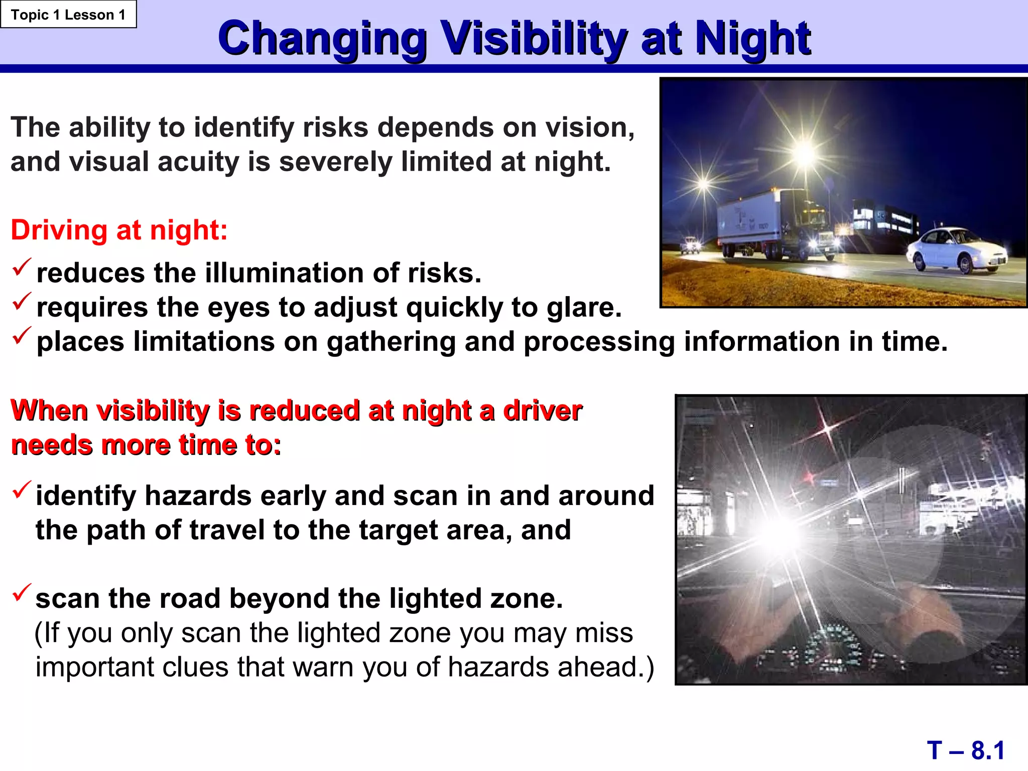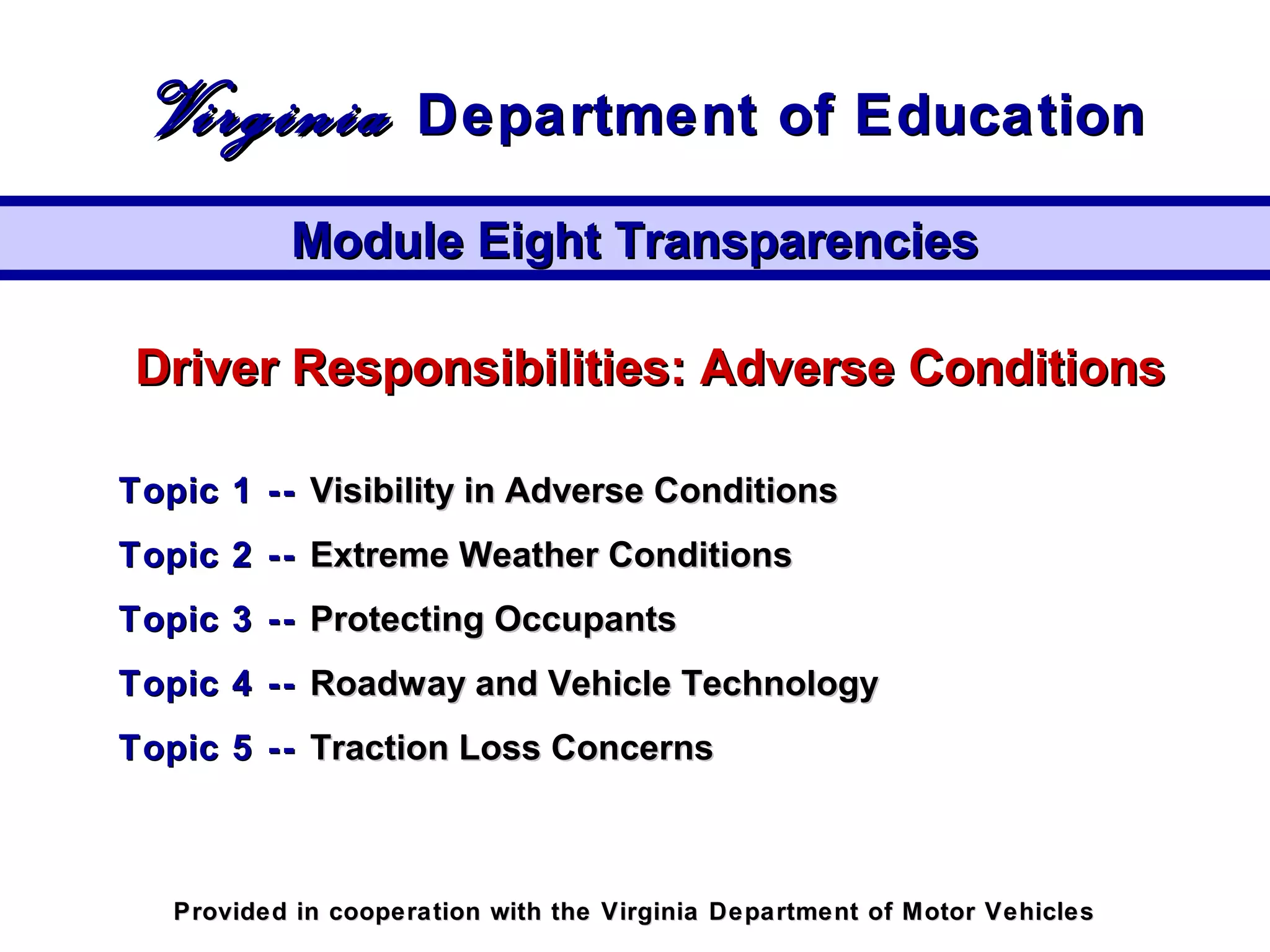 This document discusses driver responsibilities in adverse conditions and is divided into multiple topics. It addresses issues like reduced visibility at night, precautions in fog and bad weather, and dangers of low water crossings. Specific tips are provided, such as using low beam headlights in fog to reduce glare, slowing down in rain to account for longer braking distances, and understanding that flash floods are the leading cause of vehicle-related deaths. Overall, the document stresses being cautious, slowing speeds, and taking additional safety measures when visibility is limited by conditions like darkness, weather, or flooding.