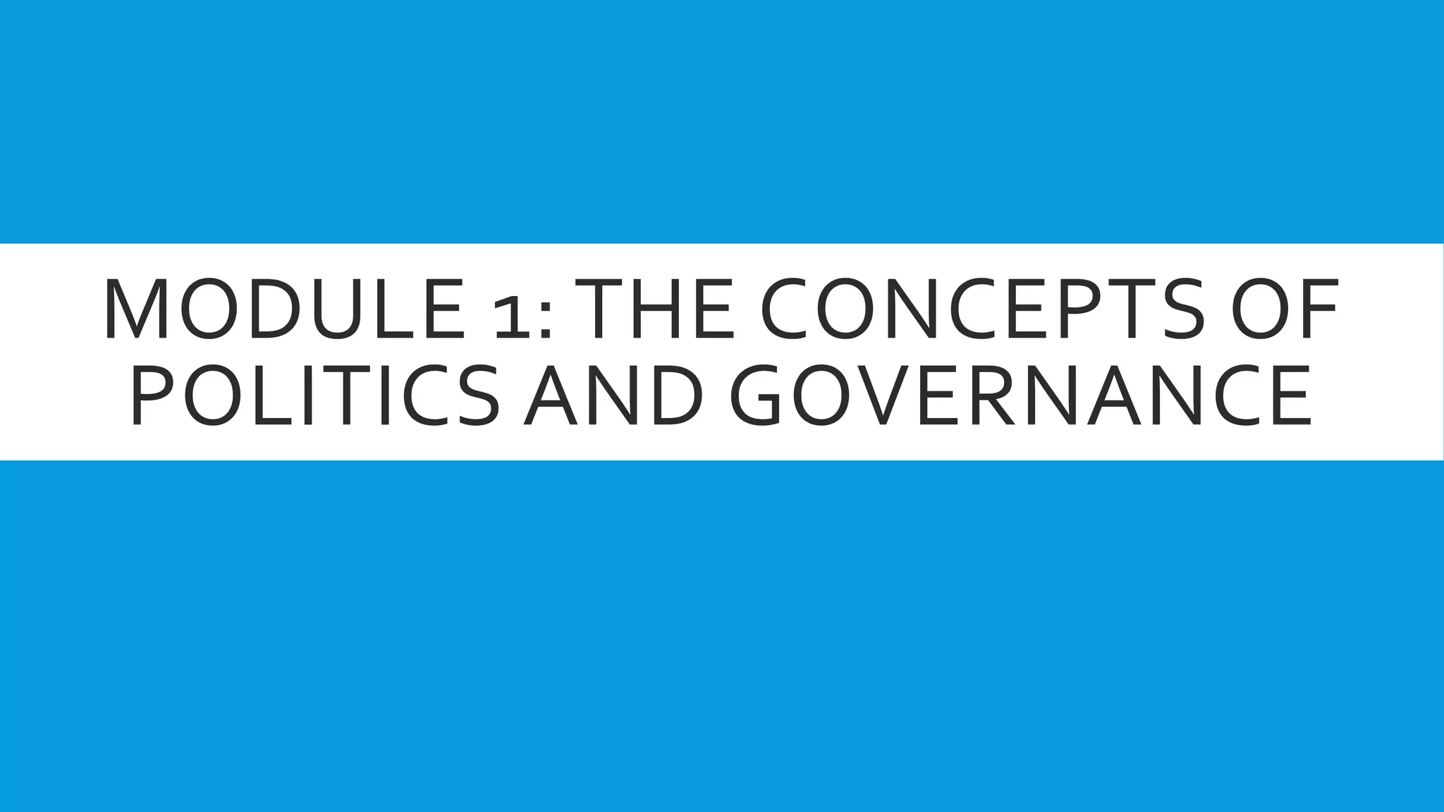 This document defines politics and differentiates between governance and government. It outlines four views of politics: as the art of government, public affairs, compromise and consensus, and power and distribution of resources. The document also defines political science and describes the key elements of a state. It notes that a government is the instrument of the state that expresses and carries out the will of the people, while governance is broader than just government. Finally, it lists three general methods for studying politics: political philosophy, empirical traditions, and scientific traditions.