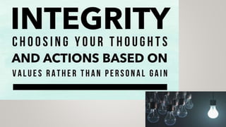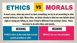 This document discusses concepts related to professional ethics including morals, values, integrity, academic integrity, work ethics, service learning, civic virtue, respect for others, caring, sharing, and honesty. It defines these terms and explains their importance. For example, it states that academic integrity is commitment to honest and moral behavior in an academic setting, while civic virtue refers to citizens prioritizing the common welfare of their community over personal interests. Overall, the document provides an overview of key aspects of professional ethics.