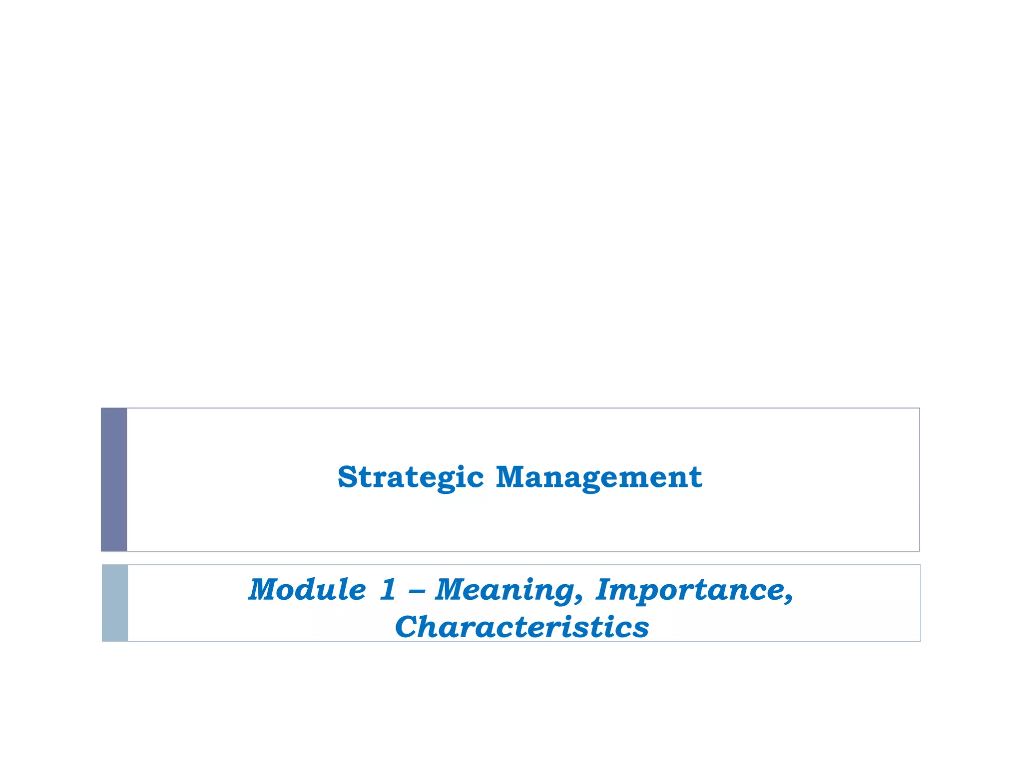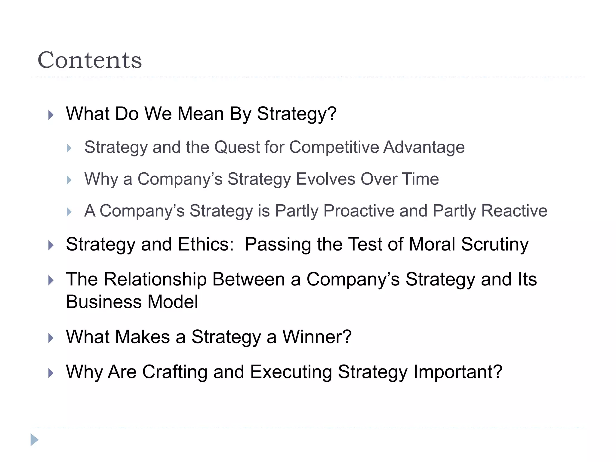 The document discusses strategic management and strategy. It defines strategy as management's action plan for growing the business, attracting customers, competing successfully, and achieving performance goals. A good strategy answers the questions of where the company needs to go and how it will get there. An effective strategy pursues competitive advantages like low costs, differentiation, niche focus, or unique capabilities. It also discusses how strategies evolve over time in response to changes. A strong strategy is connected to a viable business model where revenues exceed costs.